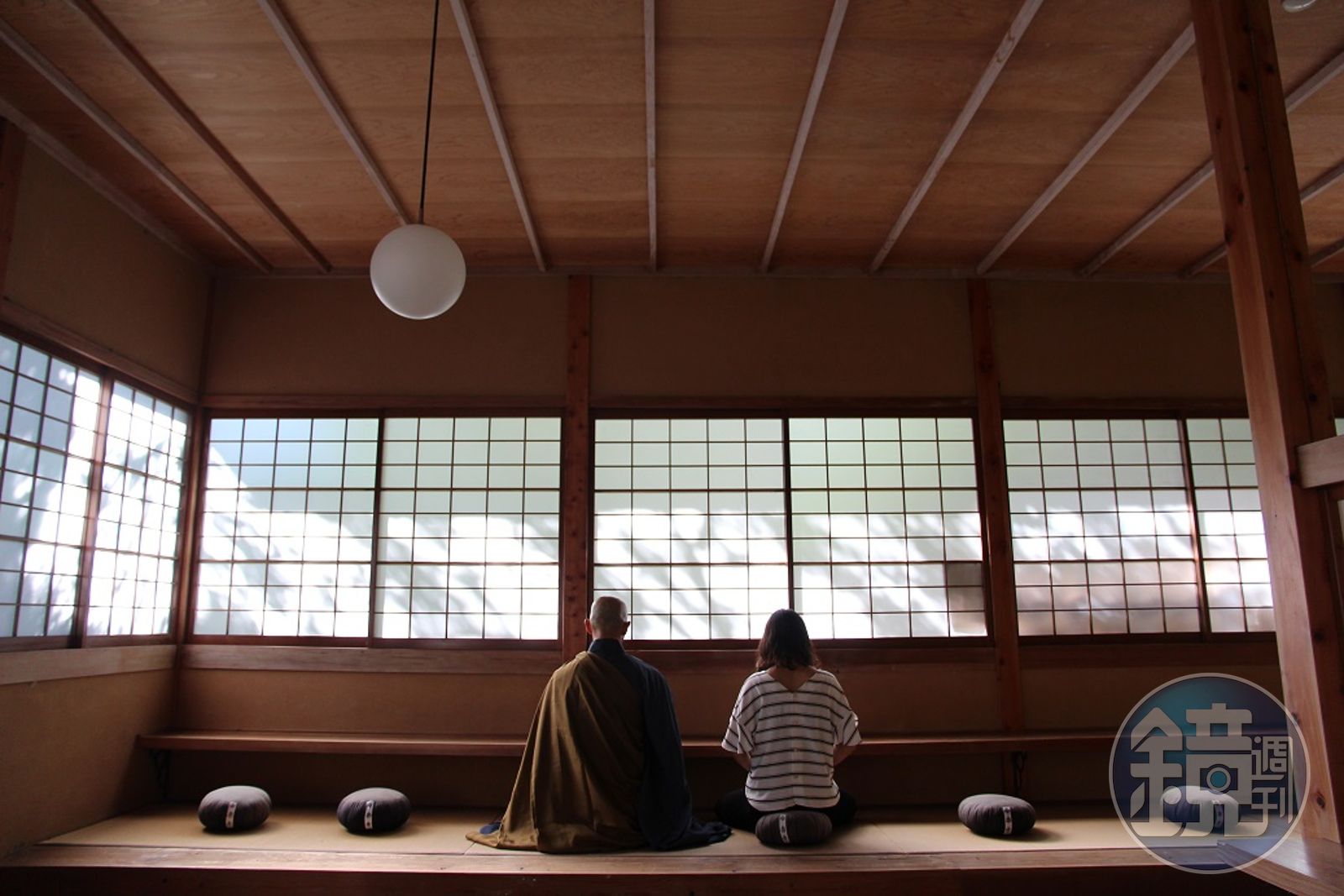 坐禪重點在調身、調息、調心,藉由無慾無想的盤坐,觀測自我的內心。在住持引領下,先在禪堂外脫鞋,向屋內鞠躬,便可走入禪堂,準備坐上坐墊。