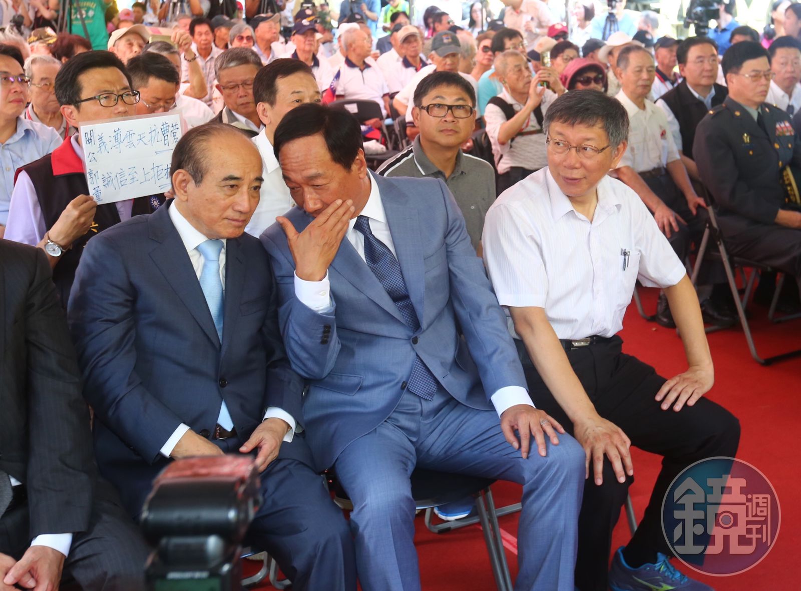 原定18日柯文哲、郭台銘、王金平同框破局,三人終於在今(23日)首度合體,在台北市長柯文哲邀請下,鴻海創辦人郭台銘與前立法院長王金平,三人同時出席北市府主辦的823砲戰紀念音樂響宴。