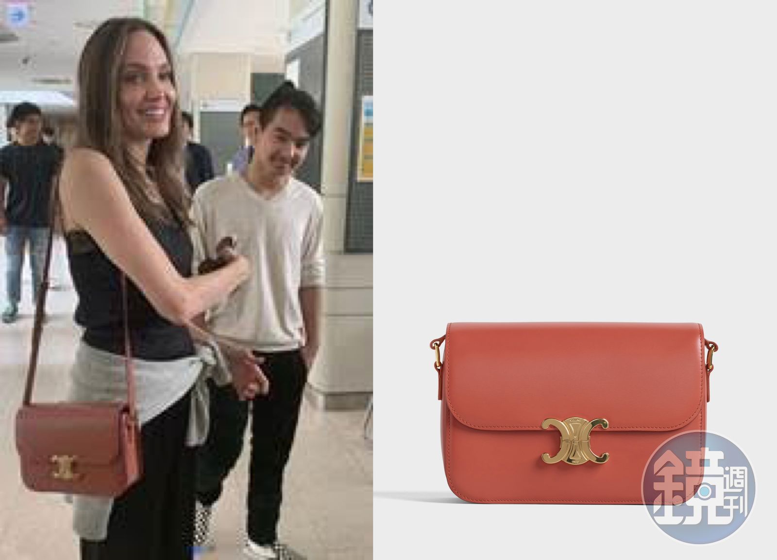 安潔莉納裘莉日前帶兒子Maddox參加韓國延世大學的新生註冊座談會,被捕抓到背著CELINE的Triomphe包。 Triomphe陶瓦紅光滑小牛皮中型肩背包 NT$115,000。(CELINE提供)發布時間:2019.08.23 13:36 臺北時間