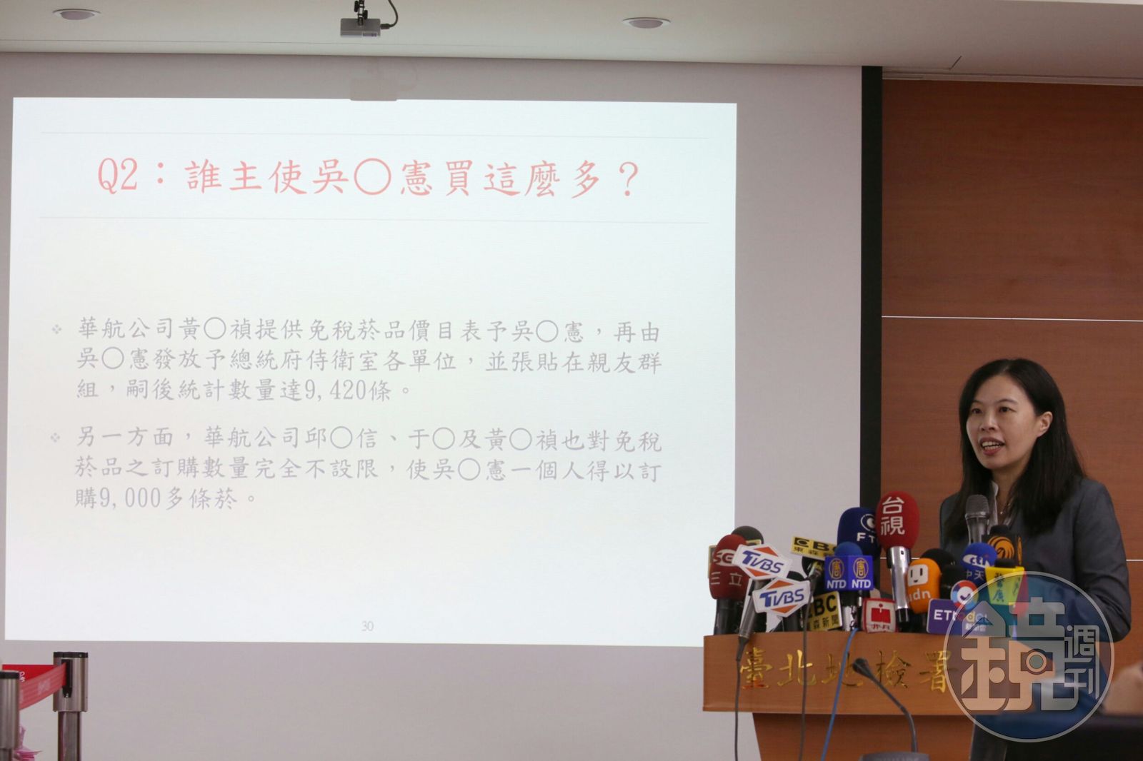 檢方指出,總統出訪有國賓禮遇通關,航辦理出訪菸品預購程序,通常是在總統出訪前2至3週,由華航空品處提供價格表給侍衛室,再回傳華航下訂買菸,這次是由空品處窗口黃川禎提供給國安局少校吳宗憲,由吳找各單位訂菸,華航白姓空服員也偷偷訂購大量買菸。