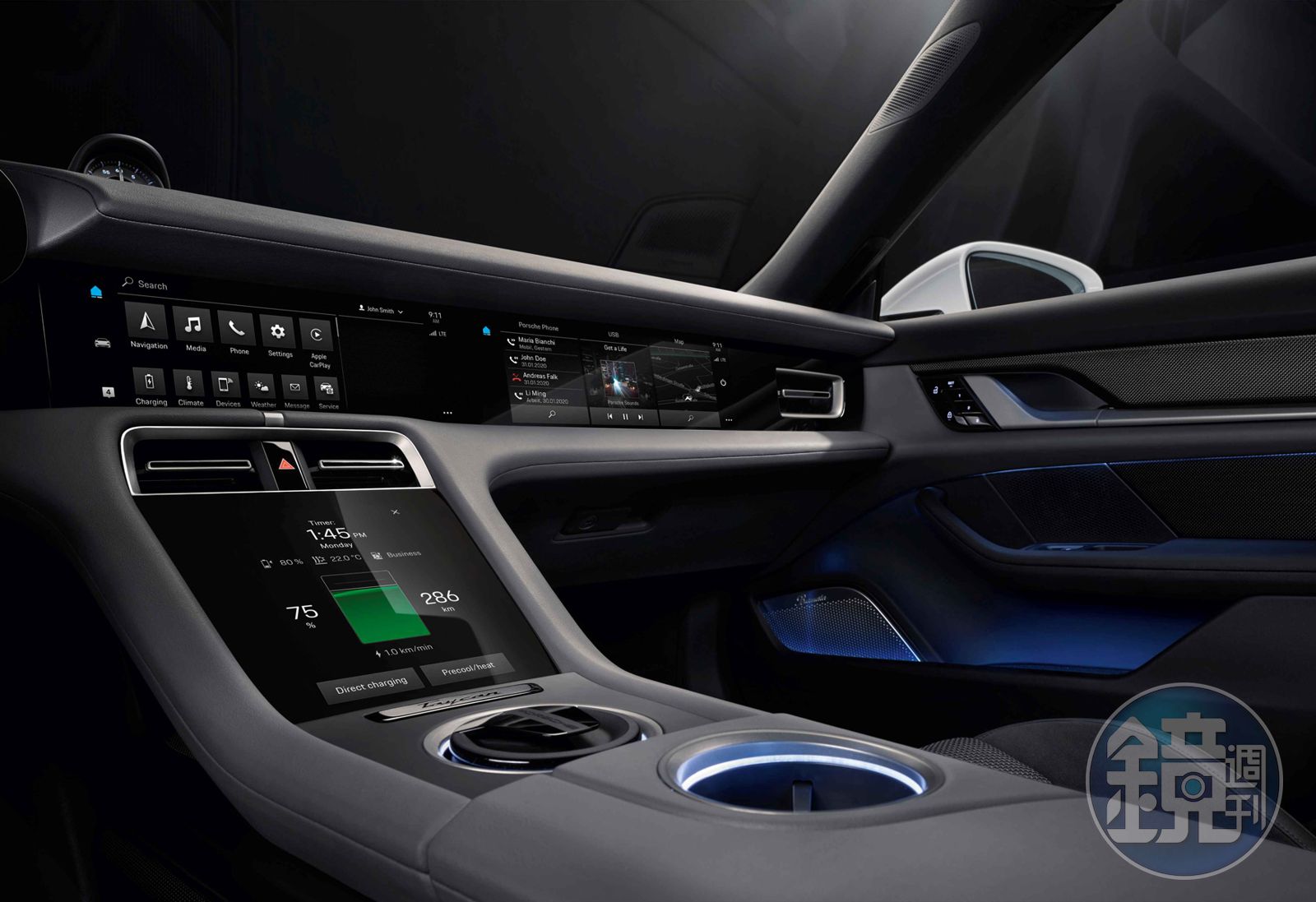 Taycan所有車輛設定,如保時捷主動式懸載調整系統(PASM),均可透過中控螢幕輕鬆設置。駕駛可透過架構清晰且可個人化的主選單快速存取所有應用程式,包括導航、電話、媒體、舒適功能與保時捷互聯功能。透過最佳化的語音控制,駕駛可以更快速存取選單內容。對保時捷而言,這也是首次副駕駛乘客擁有自己的觸控螢幕,可輕鬆改變設置而不分散駕駛人的注意力。一如保時捷跑車的設計,刻意抬升的中控台高度強化對比低矮跑車坐姿;其大型 8.4吋觸控螢幕能調整空調設定,同時作為手寫辨識區域以快速輸入地址。