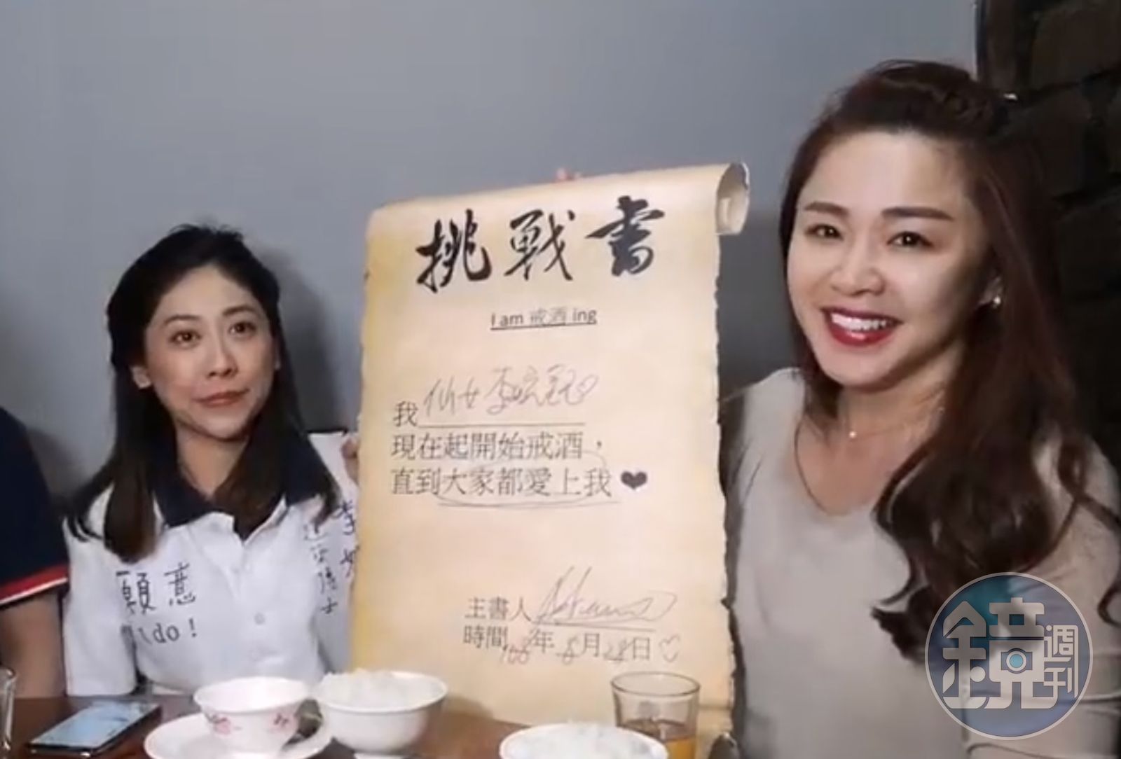 李婉鈺自嘲,自己被酒被酒害得蠻慘,然後韓國瑜也被酒害得蠻慘的,「獨戒戒不如眾戒戒,我希望能夠挑戰韓國瑜市長,我們一起來戒酒,好嗎?」這時助理也拿出挑戰書,李婉鈺也當場簽名「我仙女李婉鈺現在起開始戒酒,直到大家都愛上我。」