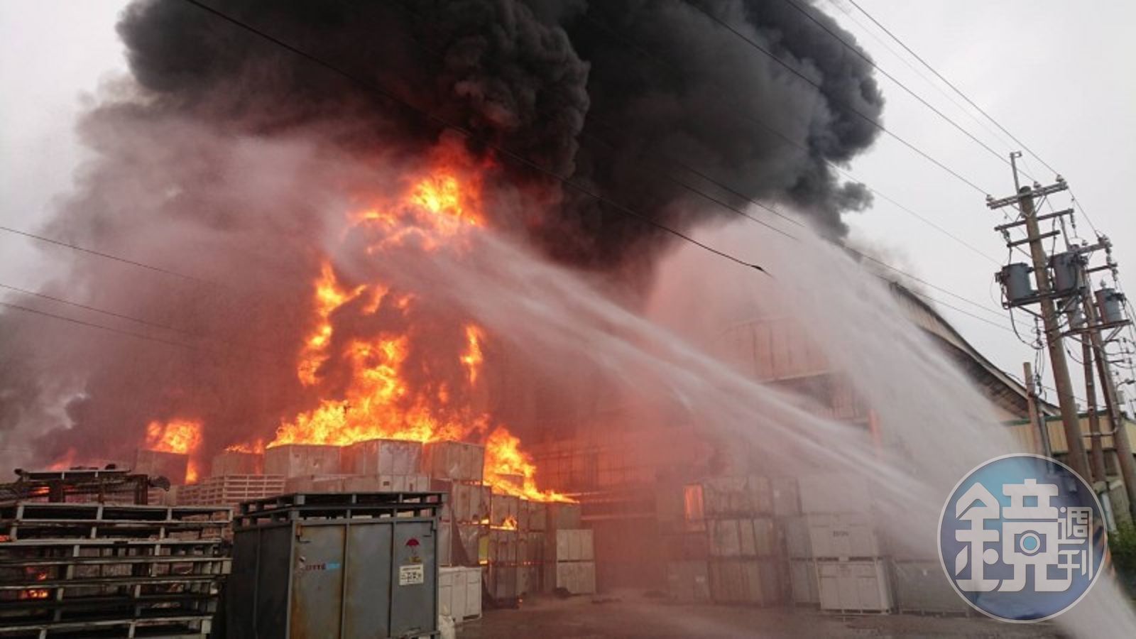 彰化縣消防局是在凌晨3點19分接獲通報,指埔心鄉永坡路一家塑膠工廠起火燃燒,119勤務中心立刻調派23輛消防車、50名消防人員前往灌救,但警消陸續抵達火場時,只見濃煙不斷竄出,火舌幾乎吞噬了半個工廠,且不斷向外擴散,消防大隊長施順仁下令同時佈下多條水線噴灑降溫。