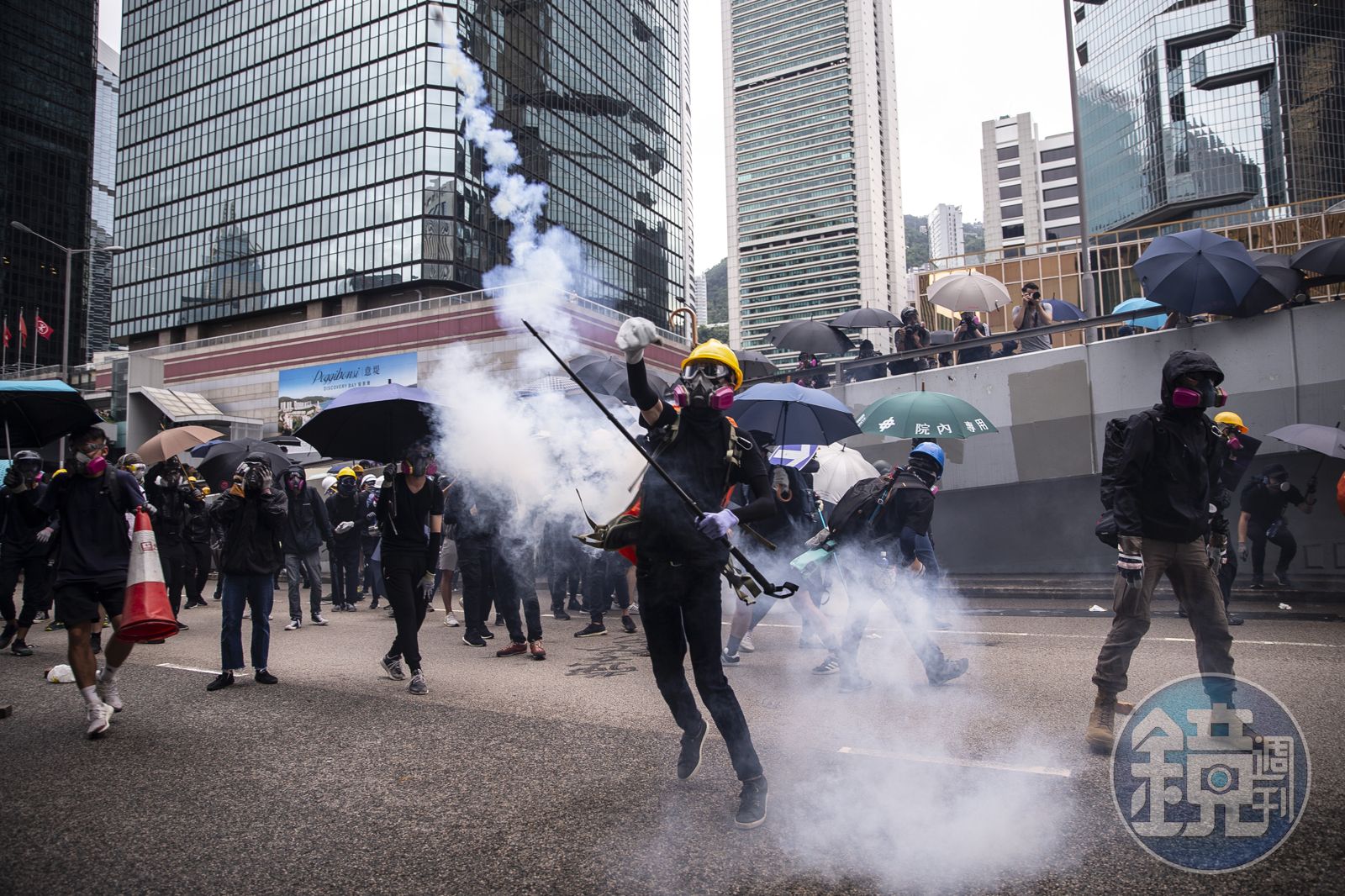 大約下午5點半,帶著頭盔、眼罩、防毒面具的示威群眾分別在夏慤道與添華道交界處的兩側分別開闢了戰場,記者群夾於其中,不時在相距大約50公尺的兩處奔波折返。示威者蹲踞著,以自製盾牌、雨傘和工地中常見的水馬作為掩體;與之相對的,是三組站在大型水馬後的行動高台上、以及數十名站在政府總部大樓高處平台上的防暴警察。