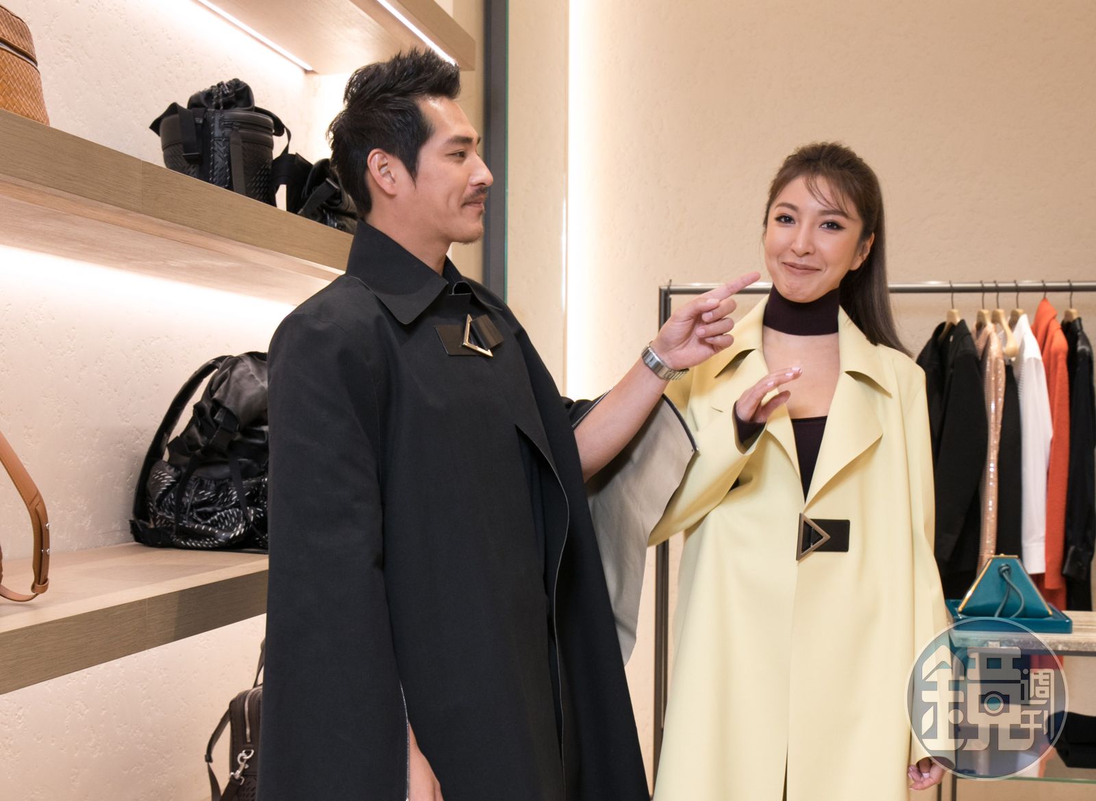 看到楊謹華仔細介紹自己的服裝,他被問到時,只好用「我自己的衣服沒有很精彩」來開場,因為怕熱的他只能在大衣裡穿上T-Shirt,而不是品牌希望的高領上衣。問他是否會想買包包給老婆?他說:「我已經送過了啊,她很開心。這個品牌對女生來說可能是夢幻逸品吧?我不是很懂,看到一堆小配件,我想不如買個包包。」不過問到他包款型號?他就一概不知,僅以「傳統的」、「咖啡色」、「編織包」來形容。