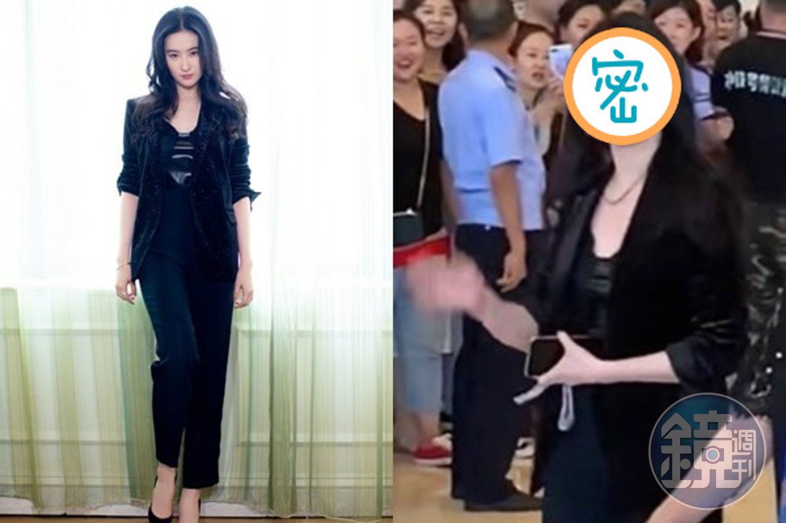 劉亦菲近期參加成龍電影週,但近日流出的現場照(右圖)和她在社群網站分享的美照(左圖)明顯「差很大」。(翻攝自微博)活動當天劉亦菲以全黑俐落的褲裝造型,獲粉絲大讚「好漂亮的仙女」「女神太美了」「永遠的女神」,不過在網友曝光的影片中,劉亦菲不僅體態微微發福,原本的V臉消失、雙下巴現形,尤其是下巴和脖子幾乎連成一線,擁腫崩壞的模樣嚇壞眾多網友,甚至還有人毒舌留言:「確實胖了很多」「快變成中年婦女了」「歲月不饒人」,女神劣化一瞬間成為茶餘飯後的熱門話題。