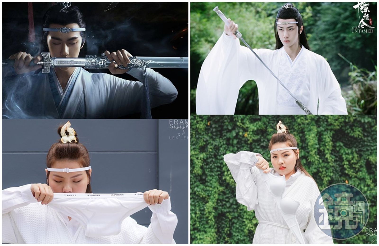 中國大陸網劇《陳情令》由騰訊以泰語配音行銷泰國,中國大陸古裝劇在泰國本就有基本盤,由男星王一博與肖戰組成的「忘羨CP」,更掀起少女好多幻想,知名的cosplay網紅Sine Benjaphorn以低成本的食物扮裝而走紅,像用鳳梨與玉米來扮水行俠就令人噴飯,她也被《陳情令》的熱潮給掃到,她扮的是男星王一博在戲中扮的角色,是性格冷淡、不苟言笑的「藍忘機」,但但但,藍忘機閉眼帥氣拔劍,她拔的卻是內褲,而另一張他拔劍帥氣的英姿,哇,Sine Benjaphorn雙手之間的,是一件胸罩。
