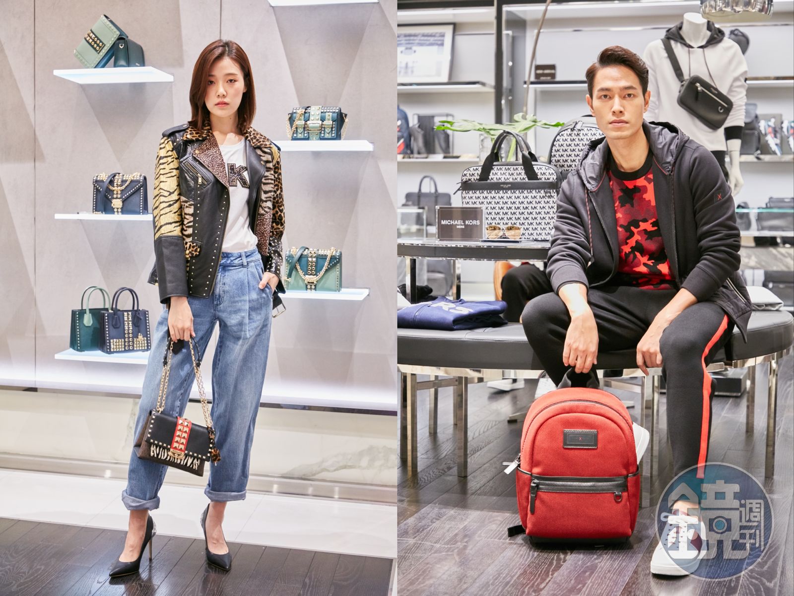 MICHAEL KORS舉辦2019秋冬新品發表會,本次女裝以Disco為主題,許多鉚釘與動物紋的混搭。而男裝則是發表KORS X TECH系列,也是首次推出運動鞋款。(女模)CECE動物紋拼接鍊包 NT$22,100、動物紋拼接夾克 NT$38,900、MK LOGO短袖上衣 NT$3,800、寬版水洗牛仔褲 NT$6,600、黑銀高跟鞋 NT$7,100(男模)KORS X TECH系列雙肩後背包 NT$13,800、黑色連帽外套 NT$9,300、迷彩衛衣 NT$8,900、黑底紅條紋窄管長褲 NT$8,900、Tyler條紋小白鞋 NT 8,300(MICHAEL KORS提供)