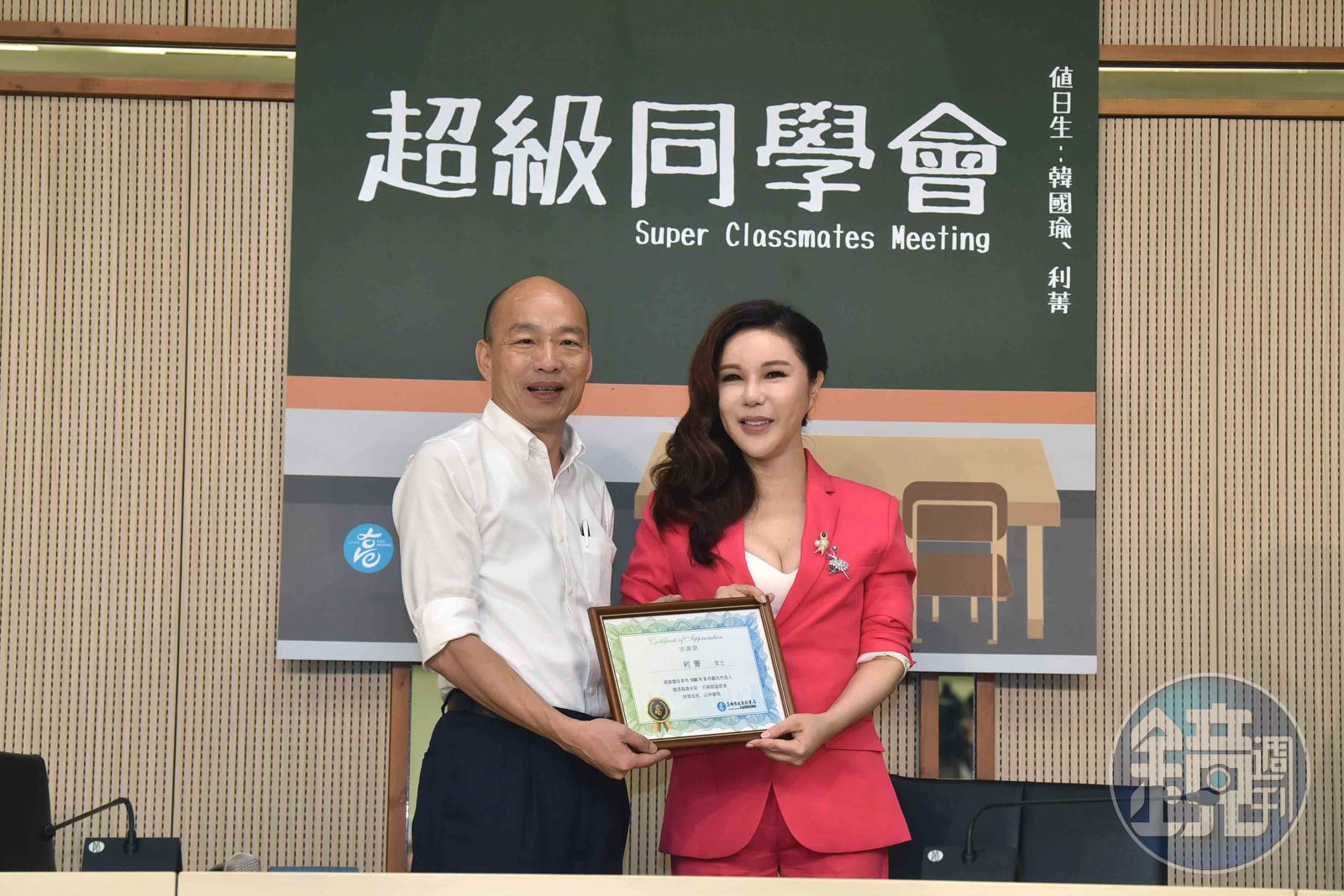 韓國瑜日前爆發學歷真假風波,東吳大學英文系的同班同學出面秀出大學出遊照片,意外扯出利菁是韓大學時期的同班同學,當時利菁出面受訪,不僅坦言想見老同學韓國瑜,也主動表示願意無償當高雄市觀光代言人,今日兩人碰面,利菁自嘲曾經是演藝圈被黑第一名來勉勵韓國瑜,把他逗的樂不可支。