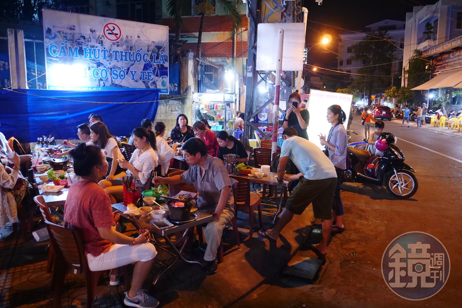 「WinWin瓦片烤肉」(Win Win Nướng Ngói )沿著巷子轉角擺起矮桌、塑膠椅,平常用來蓋屋頂的紅磚色瓦片被拿來放炭爐上烤肉,凹著的那一面就是烤盤,我們把豬腸、肉片包金針菇、豆子等食材全放上燒燙的瓦片,從食材融出來的油在底部滋滋滋地燒著,在芽莊長大的23歲女孩阮黃寶珍熟練地把瓦片一傾斜,過多的油就滑進接著的碗裡。