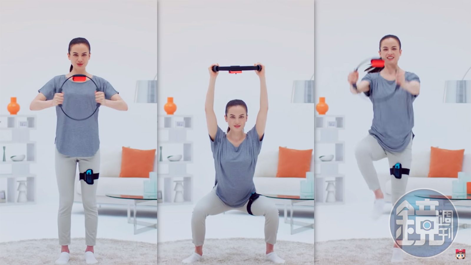 就如同先前預告影片所展示,「Ring-Con」的使用方式是將Joy-Con控制器分別裝在彈力環跟腿部固定帶上。配合Joy-Con的感測功能,類似皮拉提斯拉力環的彈力環可以感應玩家手部的動作,像是轉動、推拉;腿部固定帶則是綁在大腿上,藉以感測腿部及下半身的肢體動作。彈力環上還設計了兩個可拆卸握把,方便玩家進行清理;而Joy-Con內建的IR紅外線感應器也有新用途,可以在遊戲後記錄玩家心率。