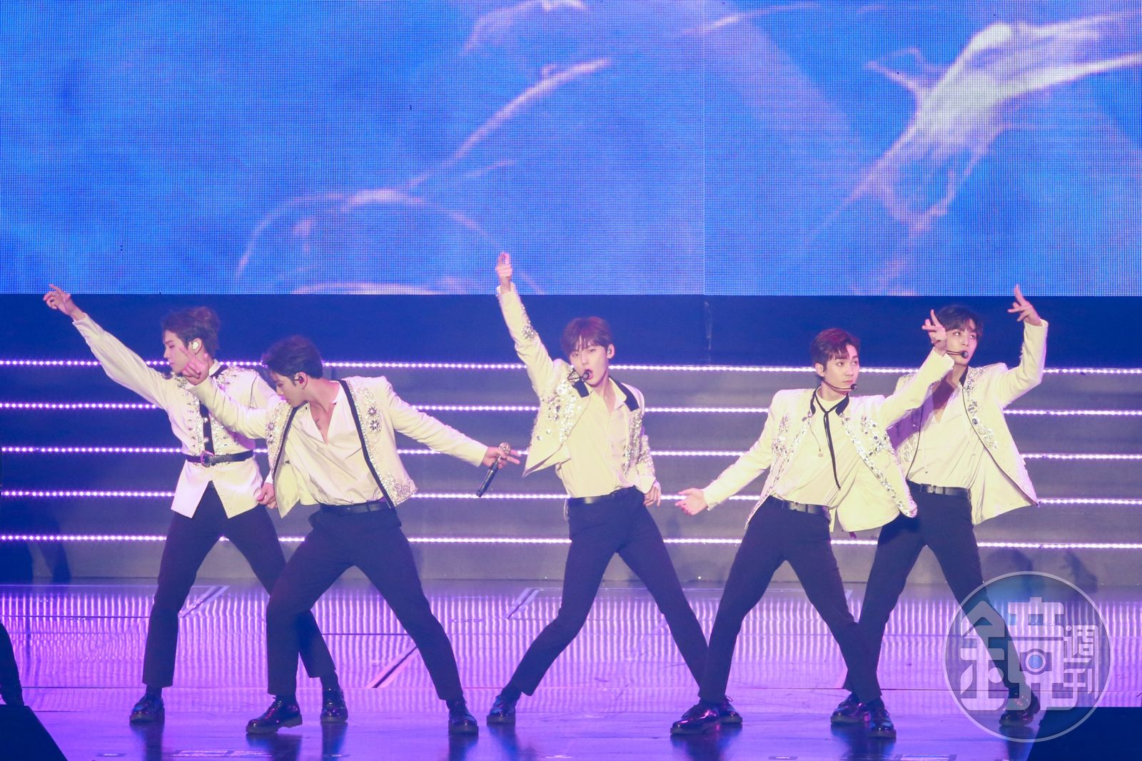 NU’EST五名成員Aron、JR、Ren、旼炫及白虎開場即以出道曲〈HELOO〉揭開序幕,當主唱旼炫唱出第一句歌詞,底下粉絲整齊又洪亮的應援幾乎震破屋頂,讓NU’EST成員們一連3首歌曲表演得格外賣力,唱完每個都汗濕了衣裳,不停拭汗。
