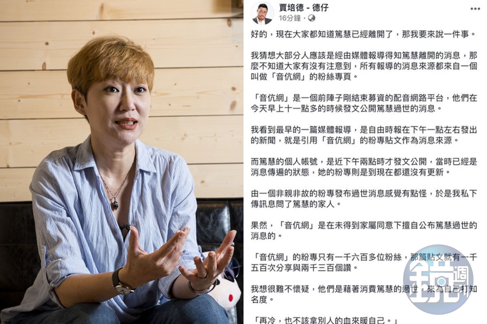 知名聲優賈培德在臉書透露,「由一個非親非故的粉專發布過世消息感覺有點怪,於是我私下傳訊息問了篤慧的家人。果然,『音伉網』是在未得到家屬同意下擅自公布篤慧過世的消息的。」