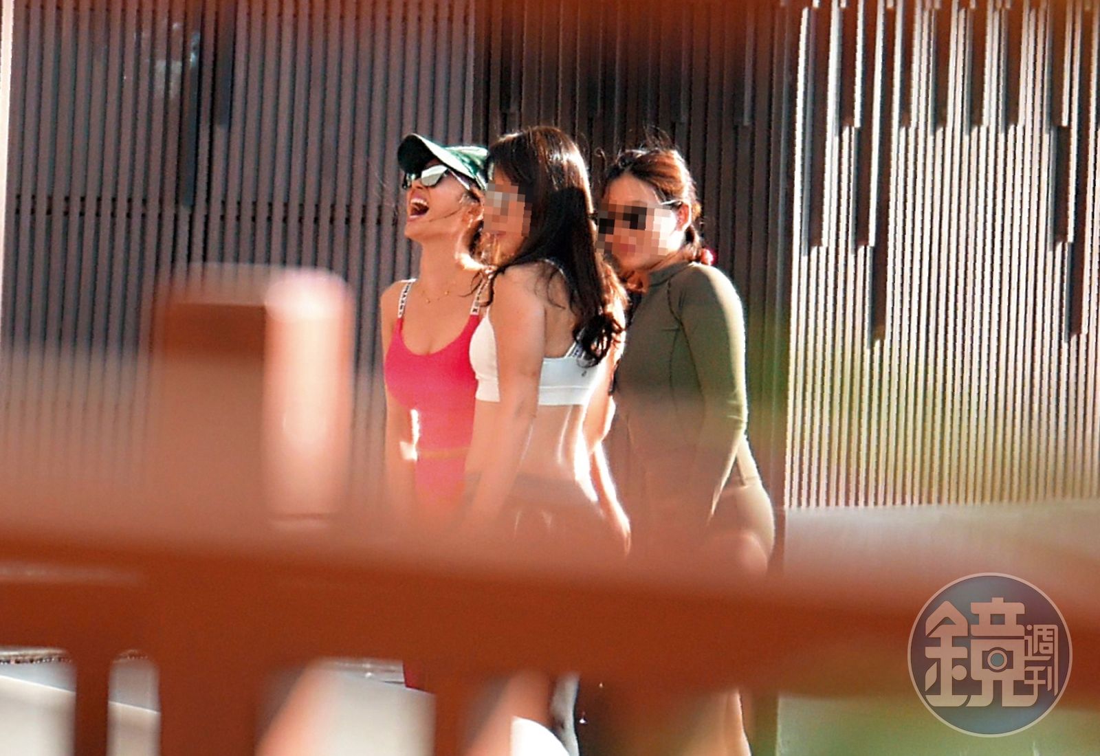 9月12日17:38,漸漸習慣度假勝地氛圍後,蔡依林(左)終於脫掉上衣,展現緊身泳裝。發布時間:2019.09.18 05:58 臺北時間