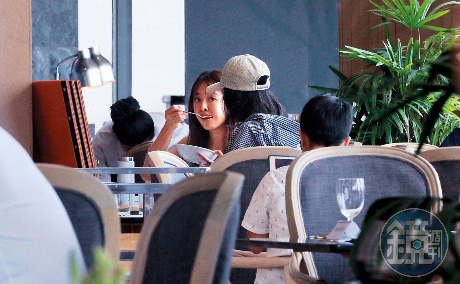 只是可能因為比較「早睡早起」,蔡依林的臉龐顯得有些水腫,豐唇變更厚了些,所幸她用餐的模樣頗為活潑俏皮,又有性感美背轉移焦點,頗有自然美。一行人用餐完畢已是下午一點多,蔡依林再度上樓更衣準備離開飯店。