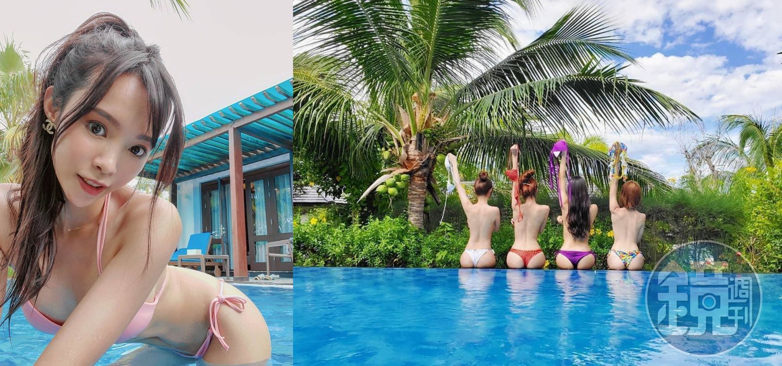 茵茵(左圖)分享與閨密們的上空照。陳夢晨(左起)、林采薇、茵茵、夏語心脫掉比基尼在越南大解放(右圖)(翻攝自茵茵IG)發布時間:2019.09.18 05:58 臺北時間
