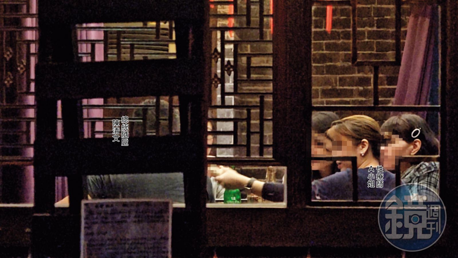 2019年08月28日22:39,陳清文和A小姐常與友人相約聚餐。8月12日晚間,本刊首度直擊,陳清文、A小姐和另外幾名女性友人,前往台北市中山區一間名為「魚紅苑」的餐廳聚餐。席間身為性治療師的A小姐一時興起,竟然拿出一根肉色的假陽具充當麥克風,扮起電視台記者作勢「訪問」陳,面對突如其來的狀況,身為總統隨扈、見過大風大浪的陳絲毫不怯場,大方對著假陽具侃侃而談,2人鹹濕又逗趣的互動,引發在場女性友人哄堂大笑。