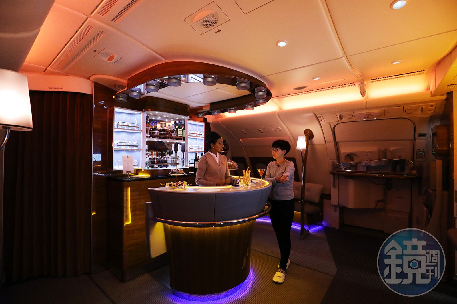 當然,這架A380客機上,最浮誇的部分就是位於二樓的空中酒吧,只要喝不醉,基本上就是無限暢飲。若喜歡低酒精濃度的人,可以選氣泡酒類的調酒,喝起來非常清爽。