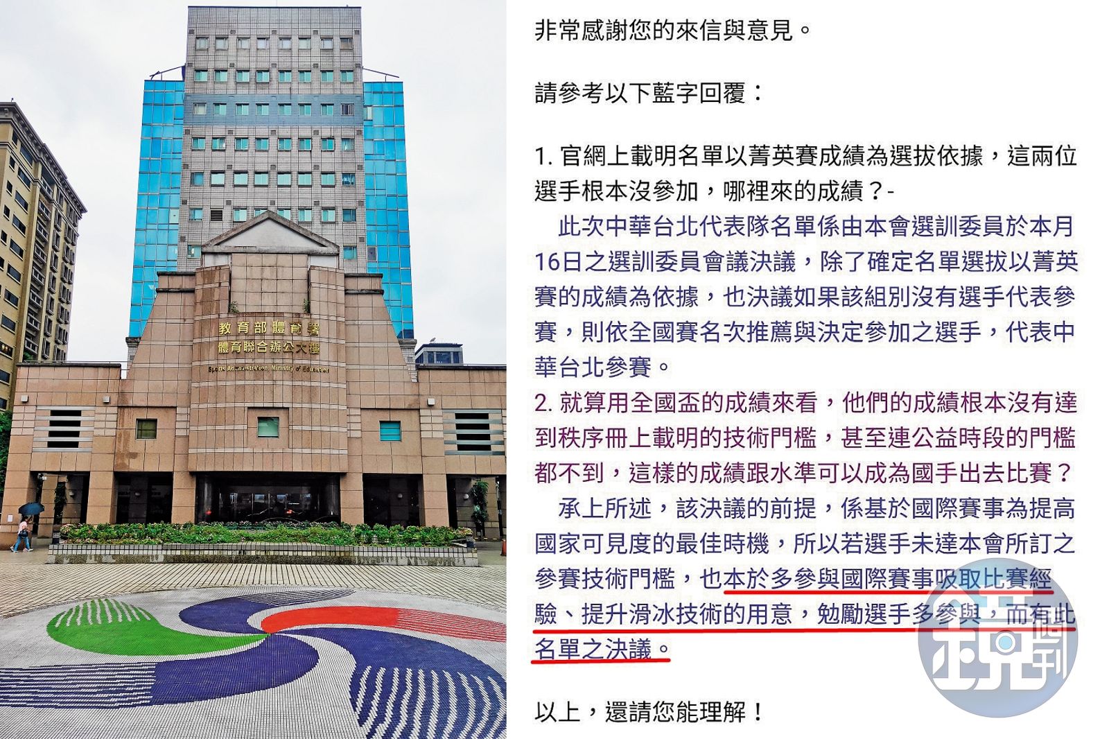 本刊調查,本屆亞錦賽11月將在中國舉辦,代表台灣參賽的國手,原本是依4月的全國菁英賽成績作為選拔標準,但這2名選手當時並未參加菁英賽,之後滑冰協會增加了8月舉辦的全國盃當成選拔依據。令人不解的是,就算根據全國盃的成績,2人也未達標準。