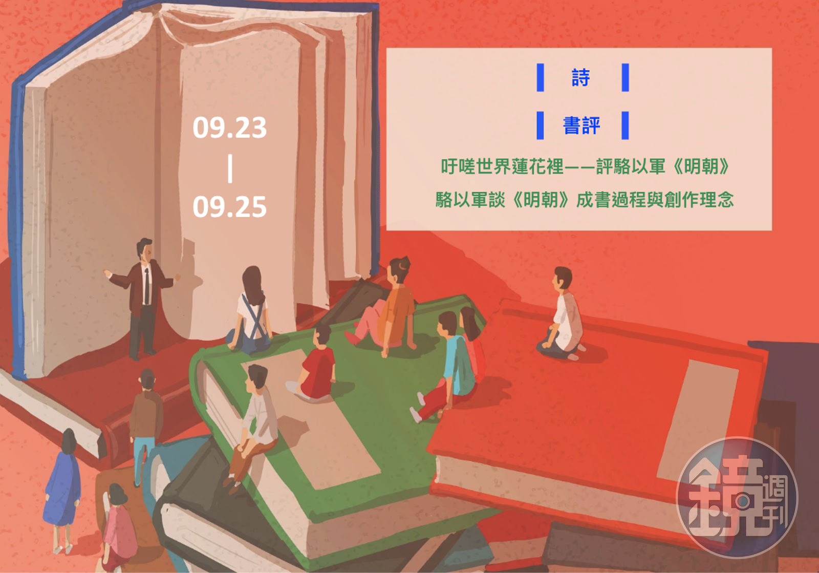 播出時間:9.23(一) 節目:詩》譚洋〈碎浪〉、夏夏〈時間煉金術〉、阿布〈輪迴〉、簡玲〈今天,我們說皮蘭〉 播出時間:9.24(二) 節目:廖偉棠書評》吁嗟世界蓮花裡——評駱以軍《明朝》 ✎ 全文連結 播出時間:9.25(三) 節目:作者訪談》駱以軍談科幻小說《明朝》的成書過程與創作理念 想聆聽您喜愛的哪一篇文章?請持續關注鏡文化粉絲專頁。