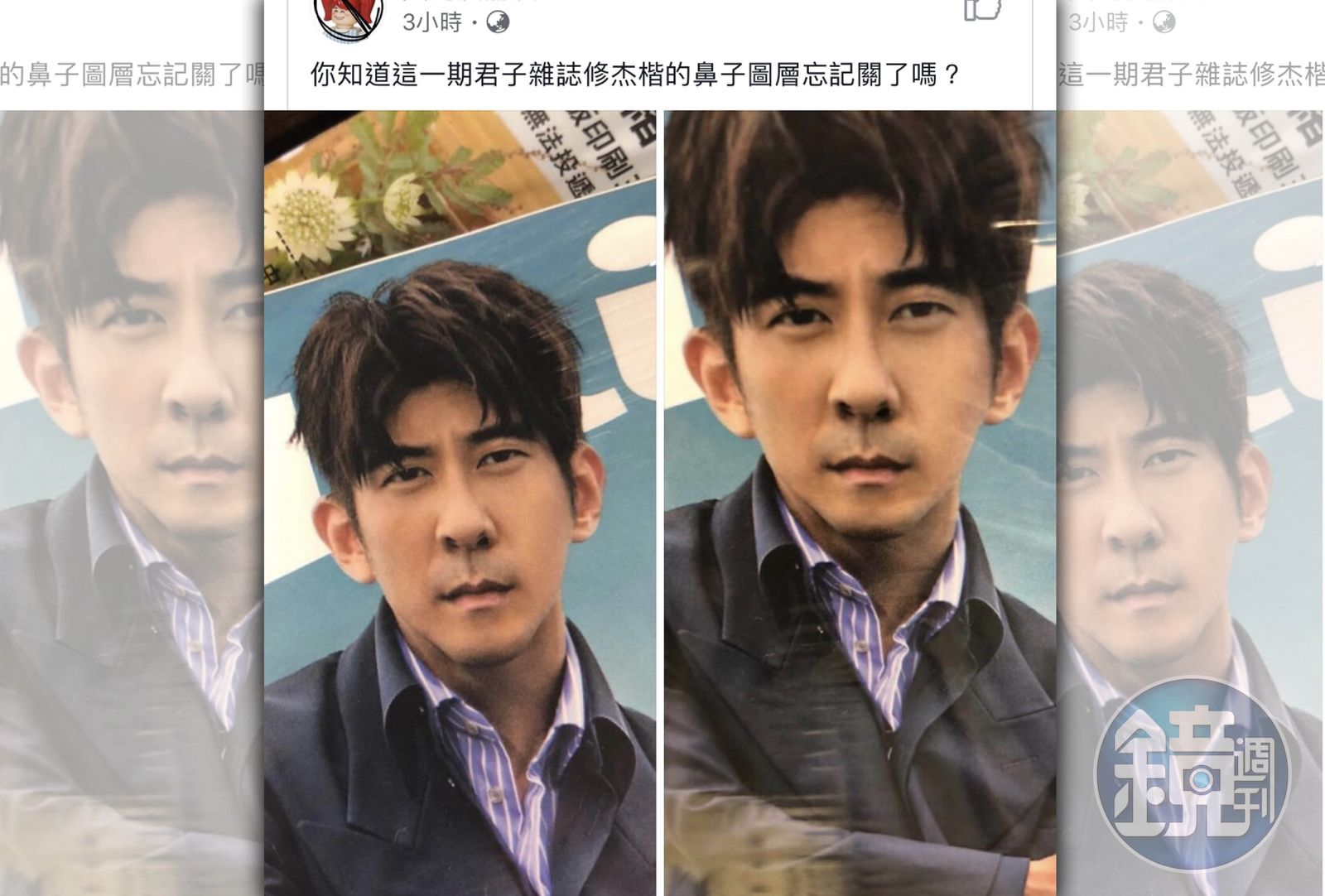 修杰楷婚後成為時尚寵兒,常常登上時尚雜誌封面。(翻攝自美到沒朋友臉書)近日就有網友在PTT發問「昨天逛某書店時發現擁有好爸爸形象的修杰楷,登上某男性時尚雜誌封面,不過看著看著覺得臉好像哪裡怪怪的」,果然網友同聲指出,修杰楷的封面照中,有4個鼻孔。