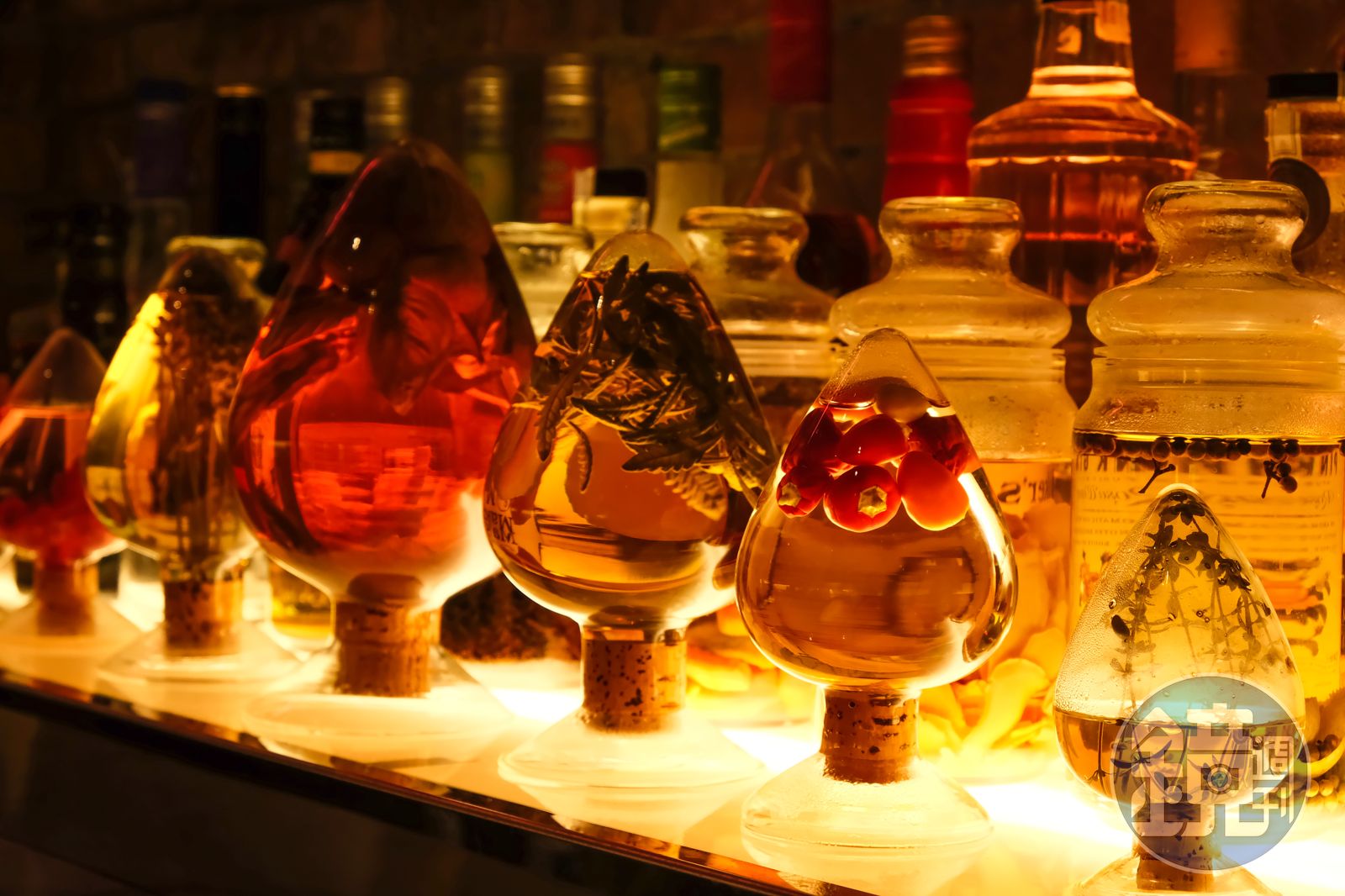 既然是以「She」為名的女力酒吧,燒酒也如女人般千姿百態,既可是直白坦率的女漢子樣貌,當然也能優雅又纖細。吧台後方懸浮在玻璃種子瓶裡的藥草和香料,可不只是擺飾,而是一瓶瓶自家浸漬的風味燒酒,用以組合成各種華麗的調酒。