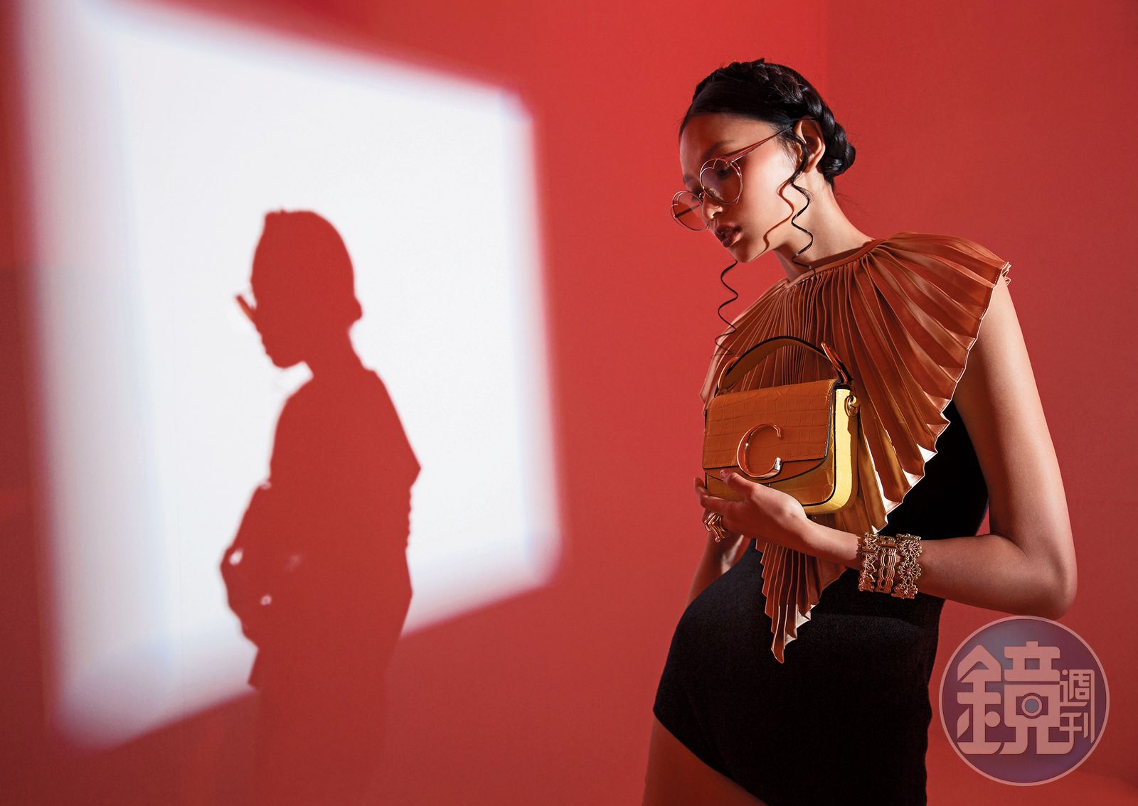 鑲嵌於外部雙層翻蓋正中央的Chloé C系列包款,