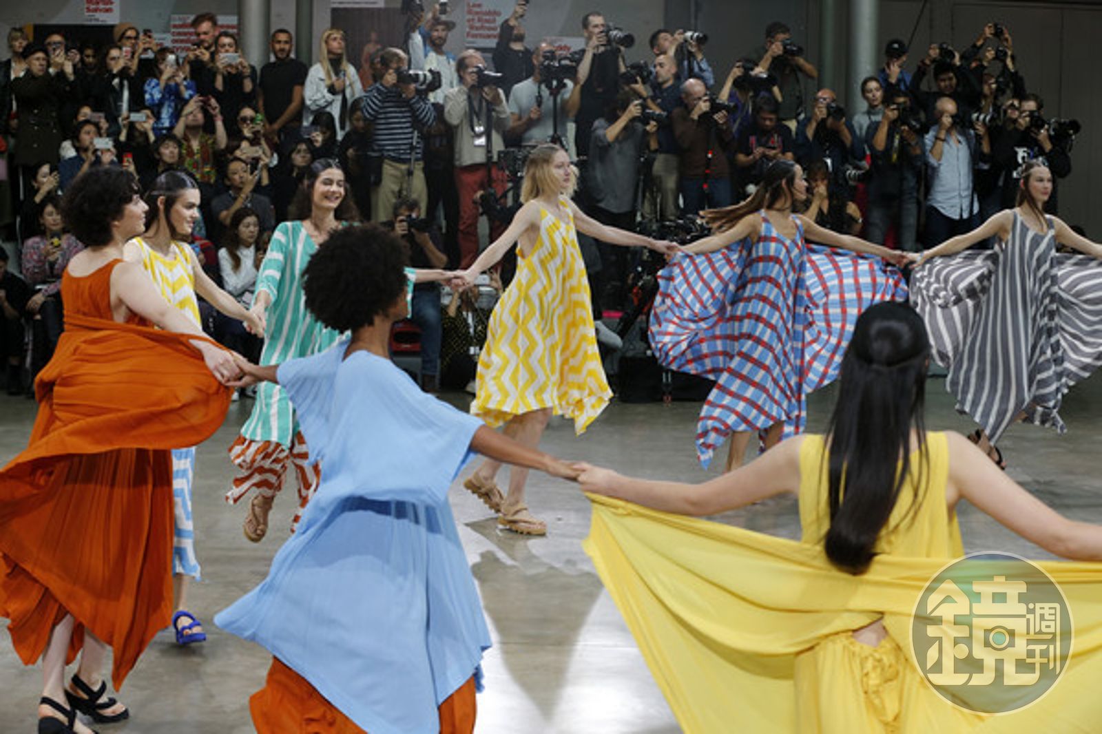 這中間近藤悟史除了以舞者的曼妙舞姿來展現大自然的流動,還找來滑板、溜冰選手,穿著風衣在場中飛舞。最有趣的是進場時見到吊掛在屋頂的裝飾,也降下成為模特兒們的衣服。最後所有的模特兒們手牽手成為一個圓,代表世上所有的人們,來自不同區域、不同世代,大家是如此與眾不同,卻成為一個完整的世界。