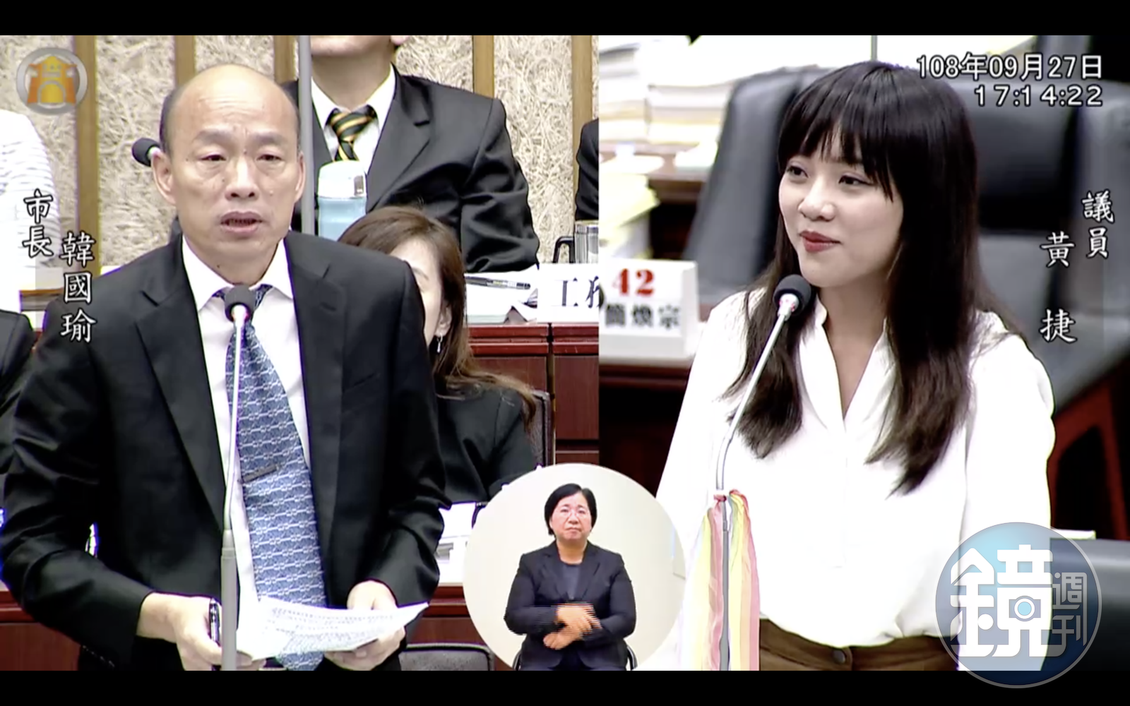 最後,黃捷提問,「針對鳳山的觀光,可以做到什麼?」沒想到韓國瑜卻回答「您的質詢琳瑯滿目很豐富,但是偏差的心態太嚴重,恕我指正妳。」接著韓國瑜開始回答起最前面黃捷的問題,並且完全不理會黃捷提出的問題,還補充「妳太多偏狹的我想要說明」、「我必須要講因為妳太偏差」始終不回答黃捷的提問。