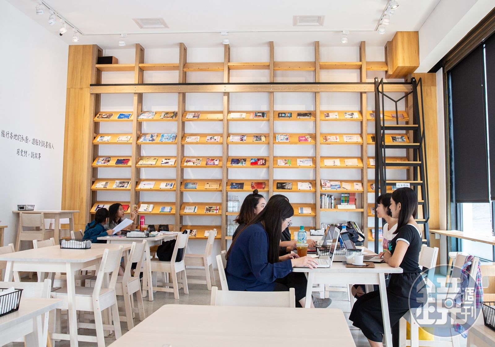 整體空間明亮高挑,有著台中咖啡館一貫的特色,左右各有一片木櫃書牆,擺放著各式旅遊書供人翻閱,吸引喜歡旅行的人來消費。七年級生的老闆陳峙達說:「這裡全部是二手旅遊書,被人看過或是劃過重點,甚至寫過評論,我想把去旅行的人的故事放進這間店。」本身是攝影玩家的他,很重視每個人背後的故事。