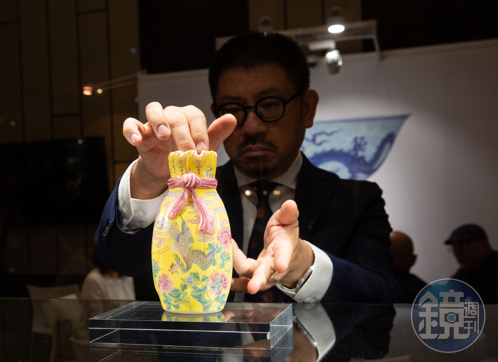 「以現存御製玻璃(料胎)畫琺瑯器而言,毫無疑問這一件狀況最佳。無論在台北或北京故宮,沒有一件的尺寸及複雜程度,能與今次這件比擬。」2週前,在台北華南銀行國際會議中心展出超過300件拍賣珍品,吸引上千位台灣買家的香港蘇富比秋拍預展上,香港蘇富比亞洲區主席仇國仕手上拿著「清乾隆料胎黃地畫琺瑯鳳舞牡丹包袱瓶」,向買家們介紹這件收藏界引頸以待的拍品,為今年秋季拍賣會揭開序幕。