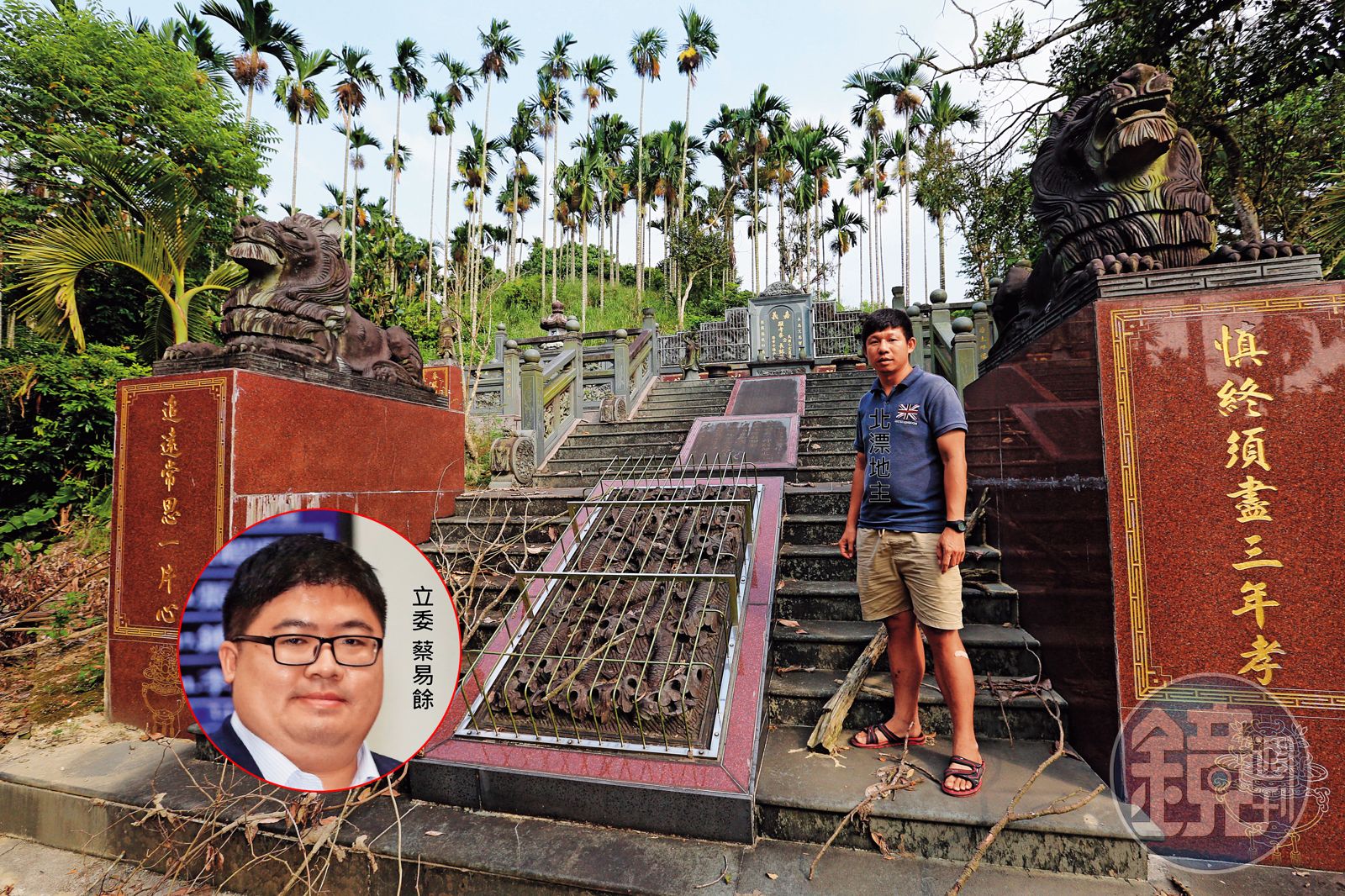 對於該筆土地鬧出糾紛,命理勘輿大師蔡上機向本刊分析,蔡啟芳家族祖墳依靠高丘,在高丘之頂下方,居高臨下,眺望遠方,風水有助子孫,依附領袖權貴,得其權勢,飛黃騰達,墓台內明堂,建設三進式階梯,乃王公貴族陵園設計,位極三公,可惜墓地風水已被檳榔樹林遮蔽,阻礙遼闊視野,三公之路恐將受阻,墓園風水能量的運勢發展可能降為中央參議士。