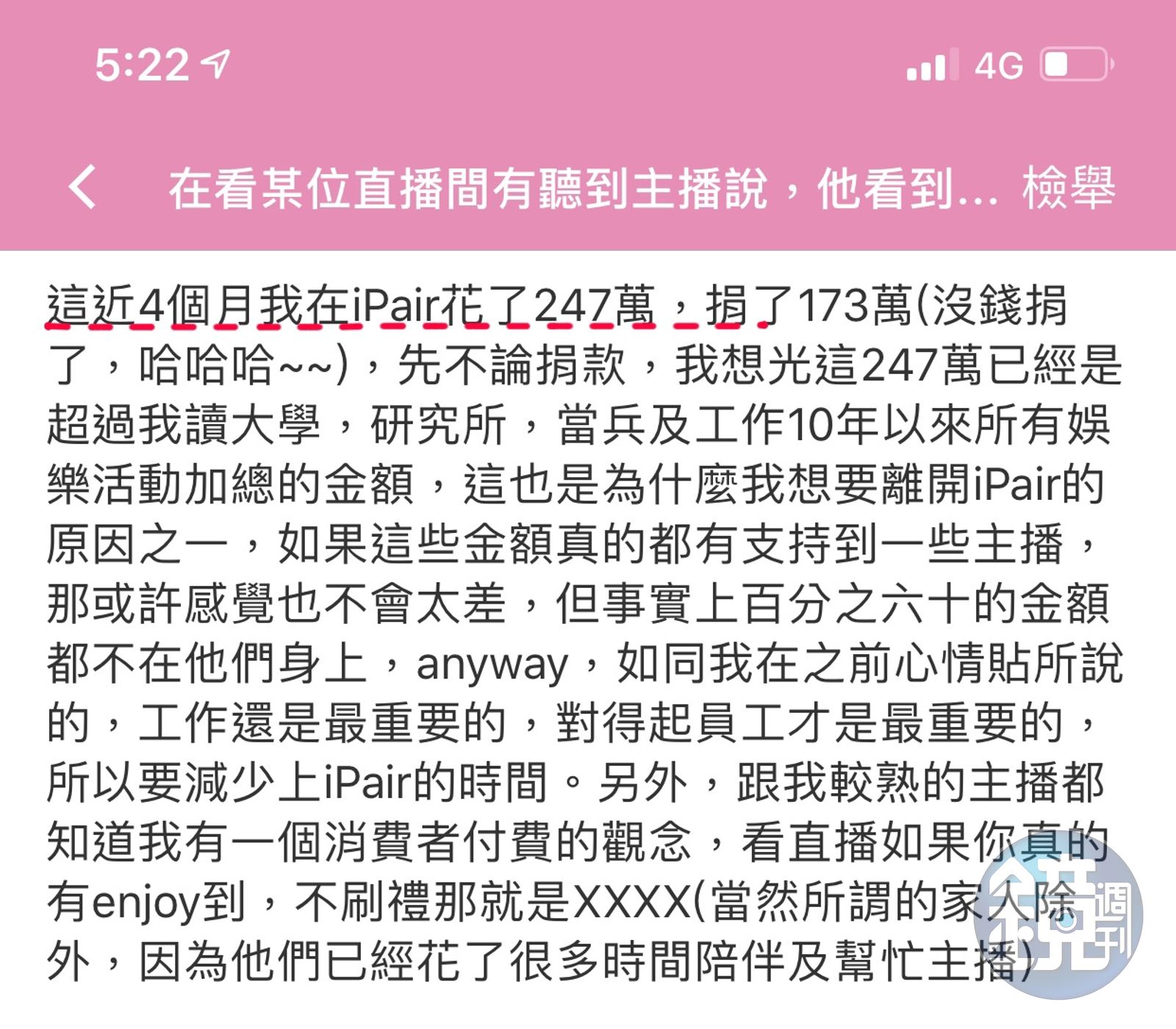蔡姓軍人喜愛的另一平台「iPair」直播,排行榜上只有名單,沒有各乾爹打賞的金額,但上週排行榜冠軍「幸福哥」上月發文自稱,他在該平台近4個月時間花了247萬元,他在文中寫道:「我有一個消費者付費的觀念,看直播如果你真的有enjoy到,不刷禮那就是XXXX」。
