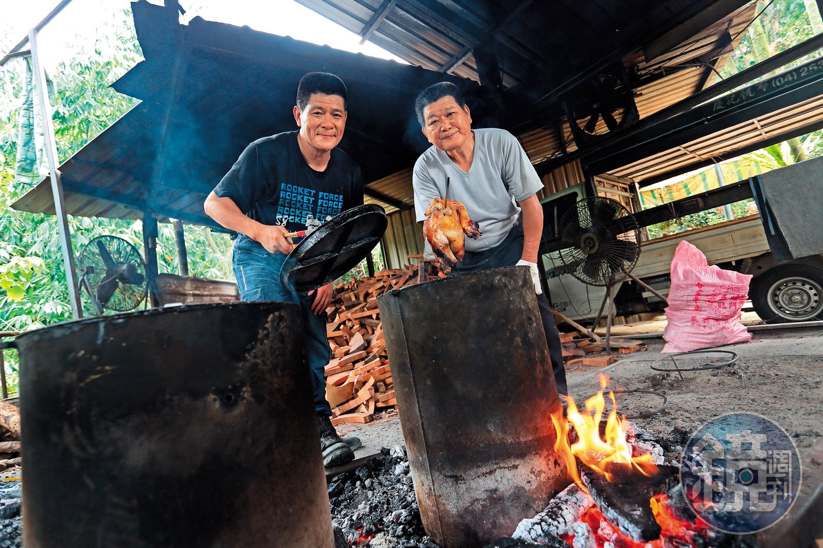69歲的父親林東村雖已交棒,仍在旁緊盯火候,瞄一眼木柴量就知道雞烤得好不好,「火不能超過桶子的高度,最好在桶身一半,火太高馬上燒焦。」創業靈感來自1994年他在台南關子嶺吃到的桶仔雞,「以前中部沒有桶仔雞,我們八個人在關子嶺吃了6隻,那邊是用沙拉油桶,一次罩一隻雞,烤一次桶子就丟了,我覺得好吃可以賣,就改成白鐵圓桶,比較厚和大,更耐用,圓形的受熱均勻,一次可串2隻雞。」