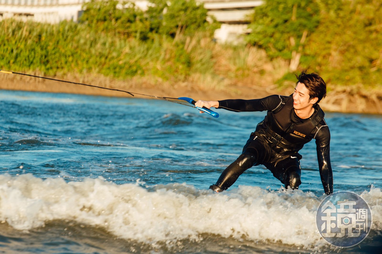 而本次廣告拍攝的最高潮,乃首次挑戰「Wakeboard寬板滑水」莫屬。悟性絕高的劉以豪在短時間內即駕馭滑水技巧,享受競技快感一次就上手!原需花費半小時練習到模擬拍攝的時程,居然不到10分鐘就完成,看的現場拍攝團隊驚呼連連!首次下水就能直接站立,甚至能靠單手站立滑水且左右切換方向,讓現場專業教練也直呼「能這樣第一次下水無練習就成功站立的人不多,重點是第一次滑水就獨自滑行10分鐘且會切換方向,真的很厲害!」劉以豪也直呼過癮「好想要再玩一次!」原本要讓教練替身以Go Pro拍攝的花式橋段,劉以豪也直接輕鬆駕馭,靠自己就能迅速拍攝完成!