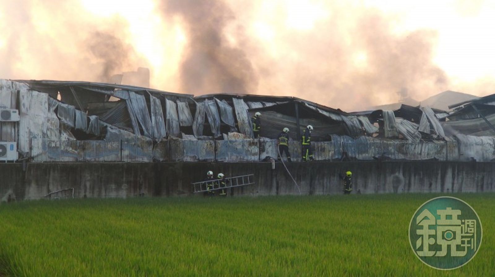今天上午,付之一炬的廠房周遭,被警消拉起封鎖線,而消防局「火調科」人員進入採證、勘查,目前已經發現起火點,初步排除人為縱火,並朝「電氣釀災」方向調查、蒐證。