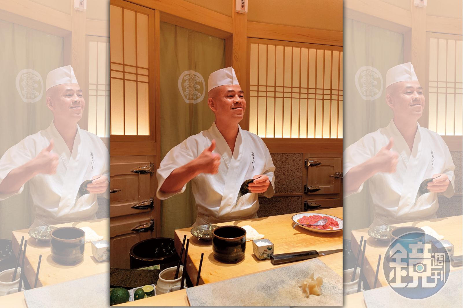齋藤主廚習慣在捏壽司之前,依照用餐人數,將生魚一片片切好,看似機械化的分切,其實在腦海裡自有盤算,根據每種食材當日的狀態、脂肪分布做出微妙的調整,考驗的是對食材性質的理解與主廚的刀工,真正是只能意會,難以言傳。