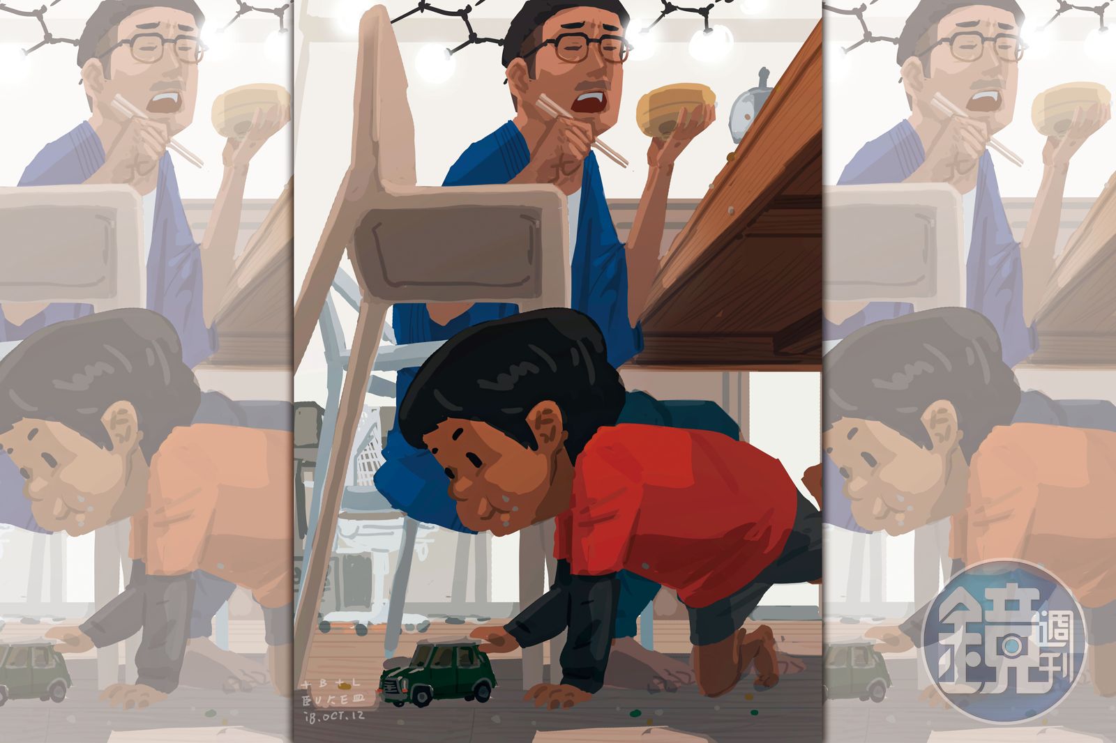 哐啷一聲,餐具又掉到地上。 我內心都覺得不好意思了,服務生還是好聲好氣一個箭步拿新的來。 有了小朋友後,在外吃飯常常選所謂的家庭餐廳。 以前不懂家庭餐廳有何特別,現在總算明白, 大概就是讓爸媽放鬆帶小孩吃飯的地方吧。