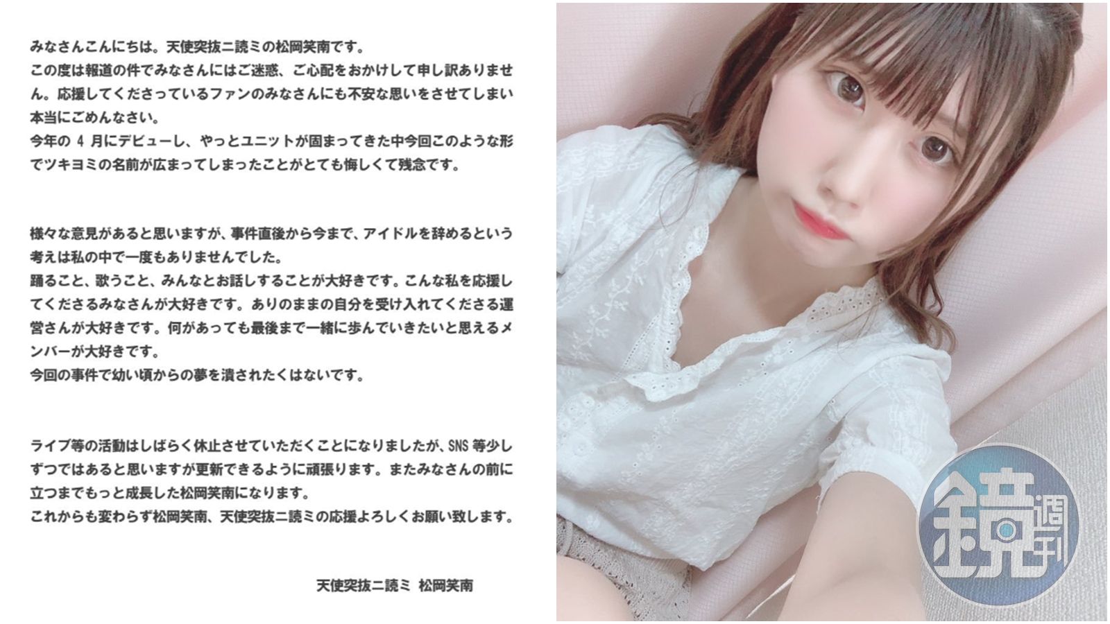 此事上月中在透過媒體傳開,松岡笑南22日透過社群媒體公開聲明,首先就和一路支持她而感到不安的粉絲道歉,並對於這件事讓更多人知道她而感到遺憾和後悔,「雖然收到各式各樣的意見,但是從事情發生到現在,放棄當偶像這件事情在我心中一次也沒有考慮過。」她表示喜歡跳舞、唱歌、和大家一起說話,因此不論發生說都說好要一起走到最後的成員,她不會因為這次的事件就擊潰從小的夢想。松岡笑南最後也提及,目前會暫時停止現場活動,也會一點一滴努力更新社群媒體,「希望能夠再次站到大家面前,讓大家看到成長後的松岡笑南。」