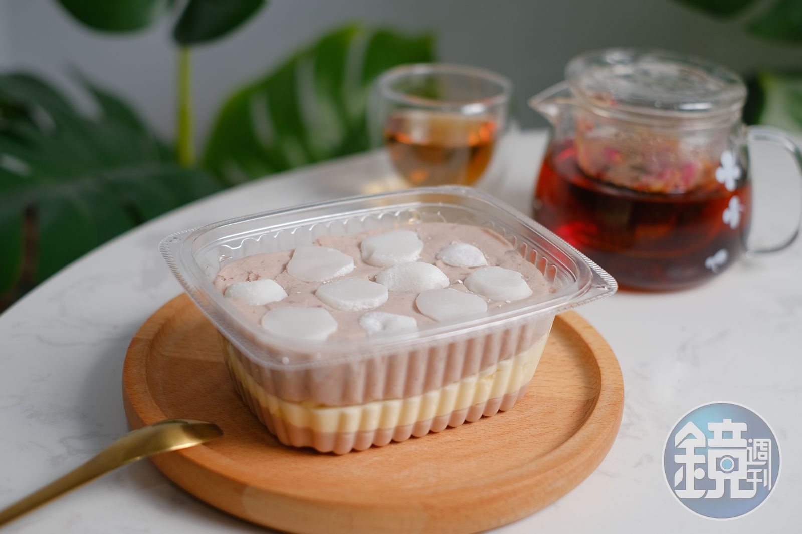 整個透明盒子看不到甜點的秀氣,只有裝好裝滿、重達半斤的大甲芋頭泥,中間夾著特調的鮮奶油餡和戚風蛋糕,最上層隨性妝點幾塊白玉麻糬。