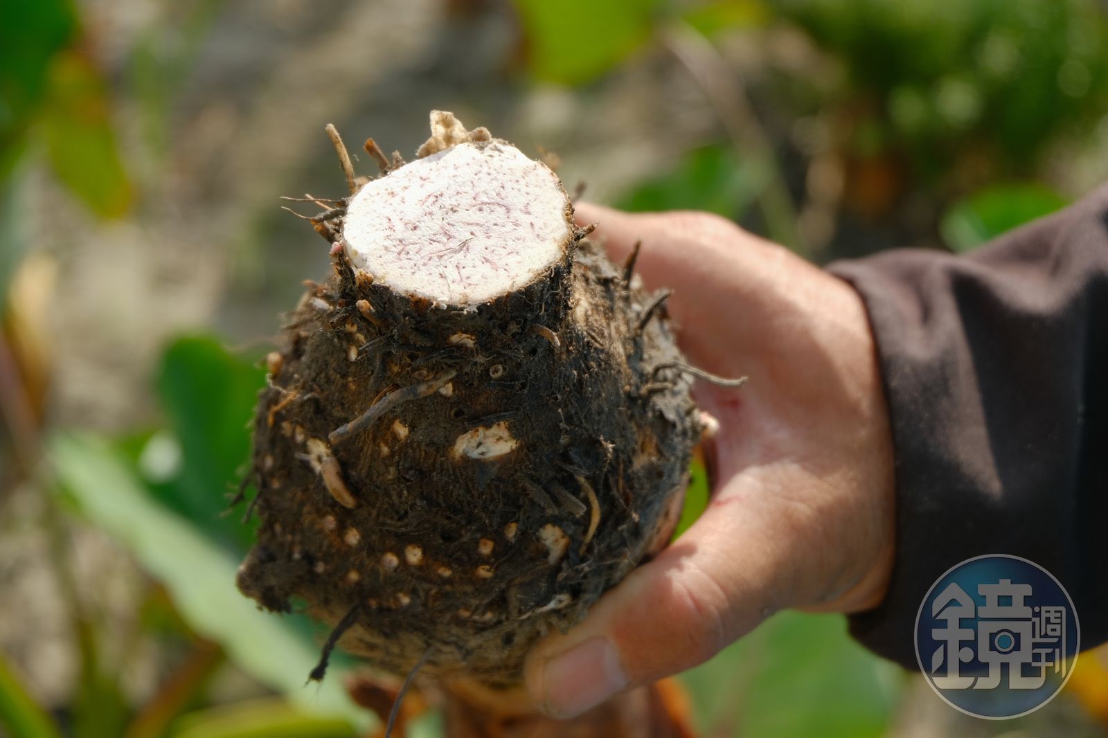 來到芋田,我看到碩壯芋頭都已探出頭,鄭生旺解釋大甲多採「水芋」方式栽種,幼芋埋土培育時,有3分之2會在土面上,長成可採收的「母芋」時,旁邊又會跟著「子芋」,農民再讓子芋長成明年的母芋,生生不息。