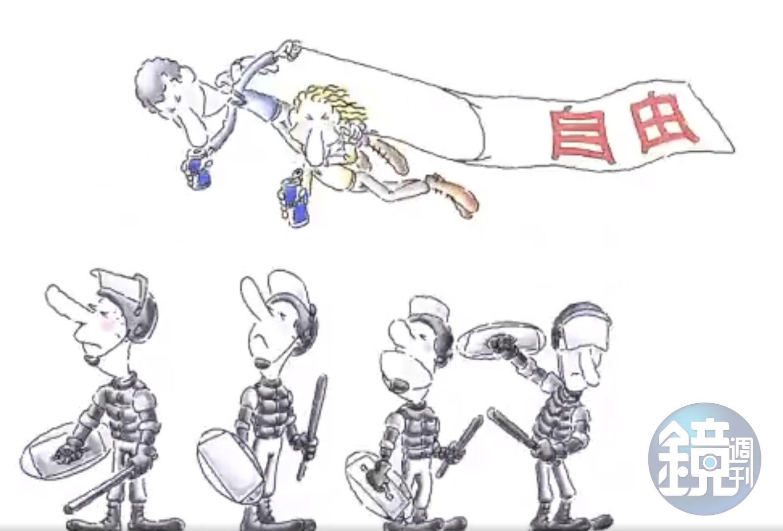 紅牛集團的廣告中,舉著「Liberte(自由)」、「Freedom」標語的示威者,接連被警方取走告示牌或當場抬走,還有一群穿著鎮暴裝、手拿警棍的員警,看著長了翅膀的示威者,拉著「自由」布條往天空飛去。
