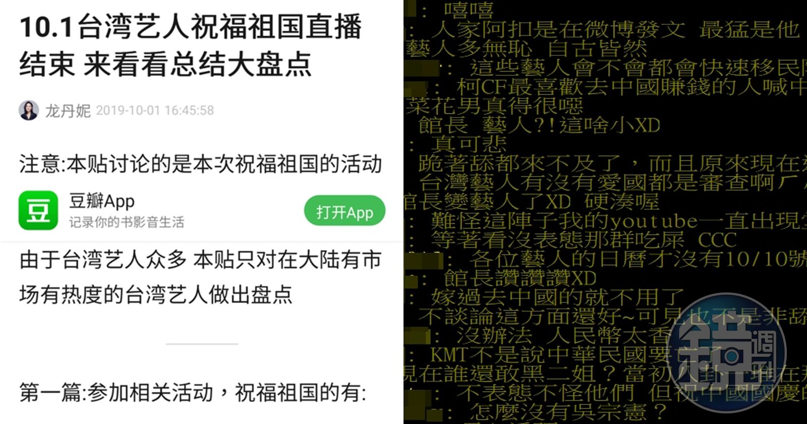 當天豆瓣署名「龍丹妮」的用戶開了「10.1台灣藝人祝福祖國 來看看總結大盤點」的帖子,將台灣藝人參與對岸國慶分為2類,第一類是「參加相關活動、祝福祖國」的,包括林志玲、王力宏、張韶涵、歐陽娜娜、羅志祥、張惠妹、彭于晏、王大陸等多達42人,炎亞綸還錄祝福影片。一些在IG或微博按讚的像是禾浩辰、大S等人也被歸屬在這類。