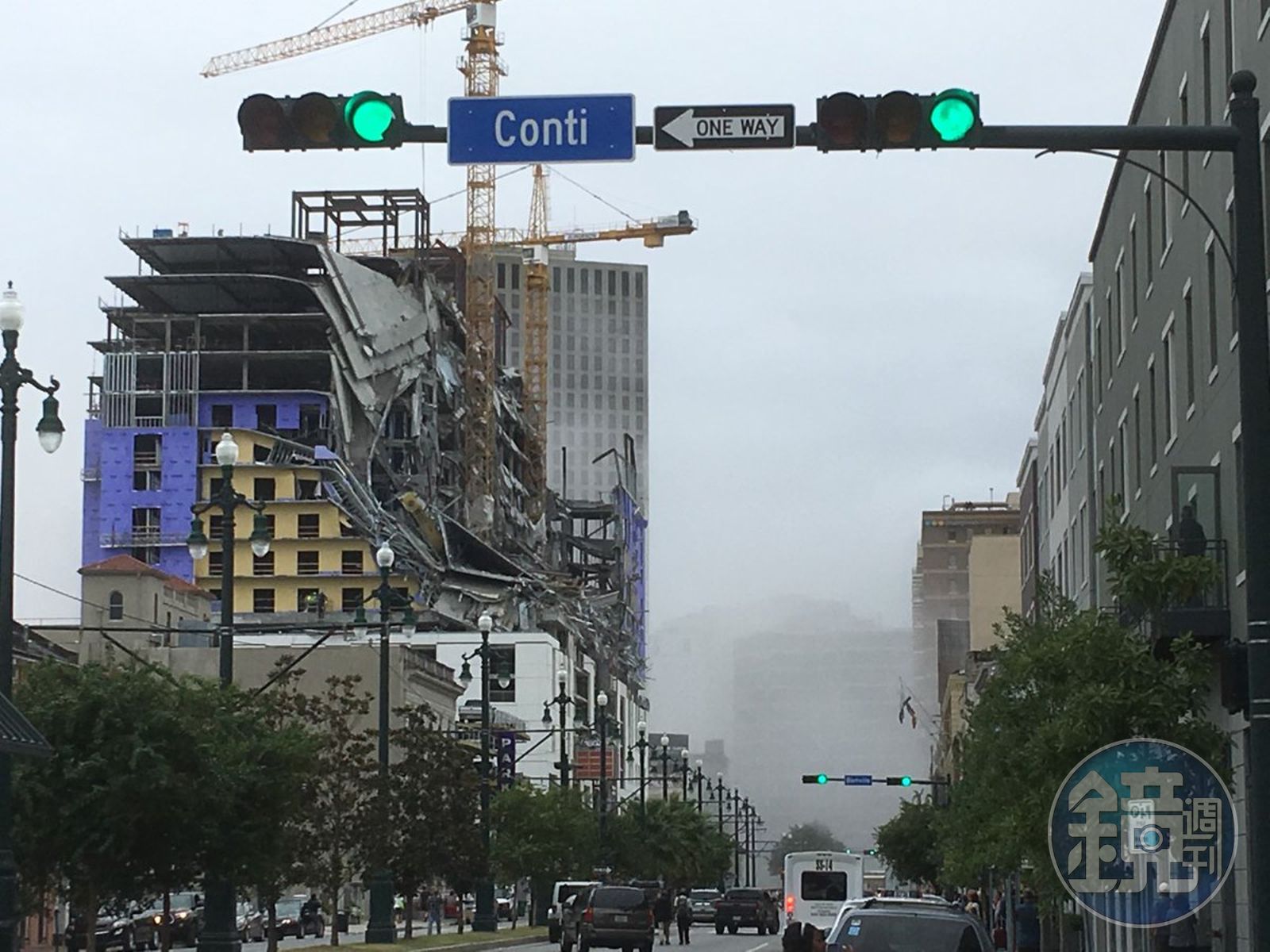 正在興建當中硬石酒店突然倒塌,造成造成1死18傷,並傳出還有2人受困失蹤。(翻攝自WWL-TV)發布時間:2019.10.13 10:16 臺北時間