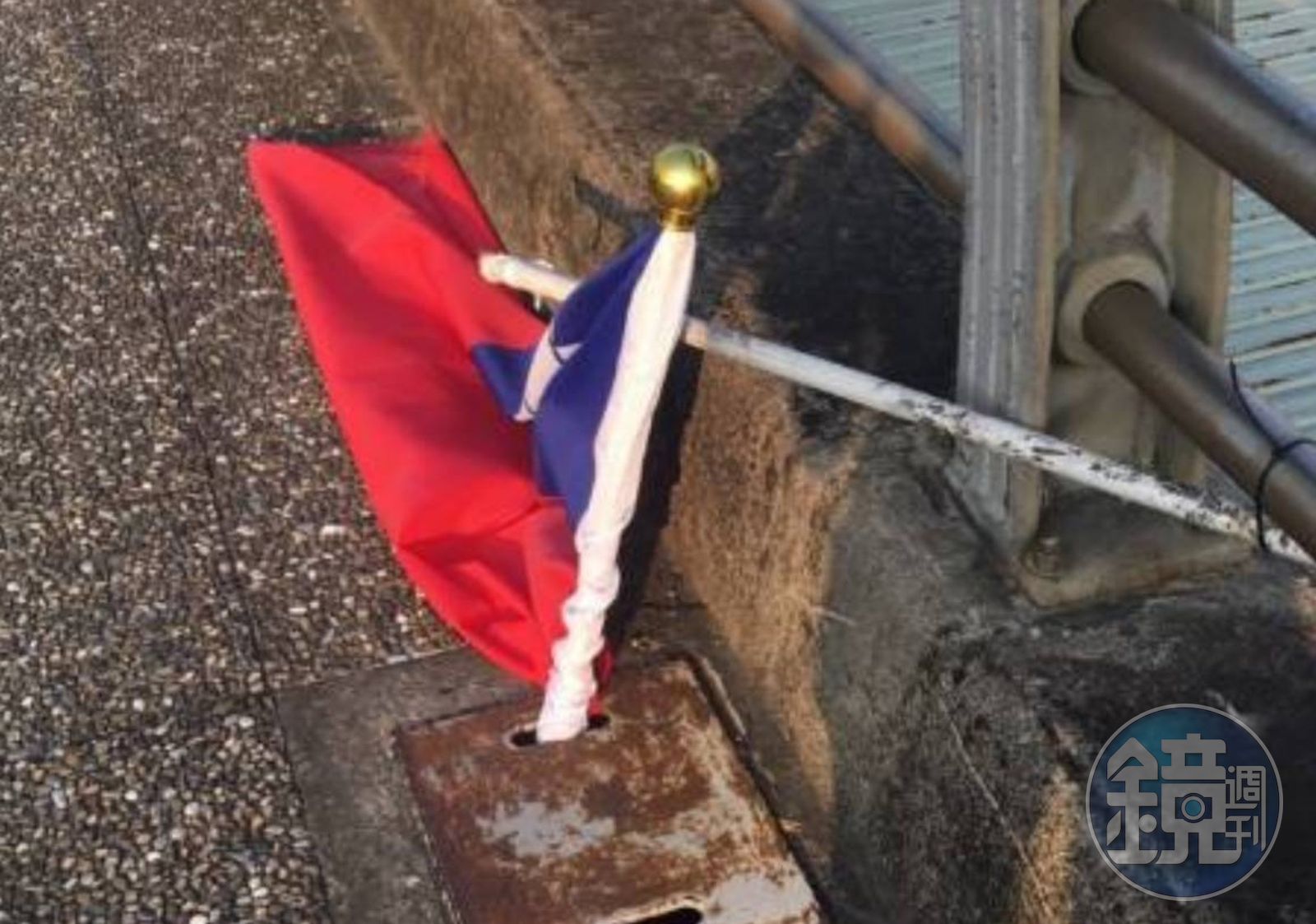 林男在折斷旗桿後還將國旗插在水溝蓋上,一度引發民眾不滿。(翻攝畫面)發布時間:2019.10.13 17:14 臺北時間
