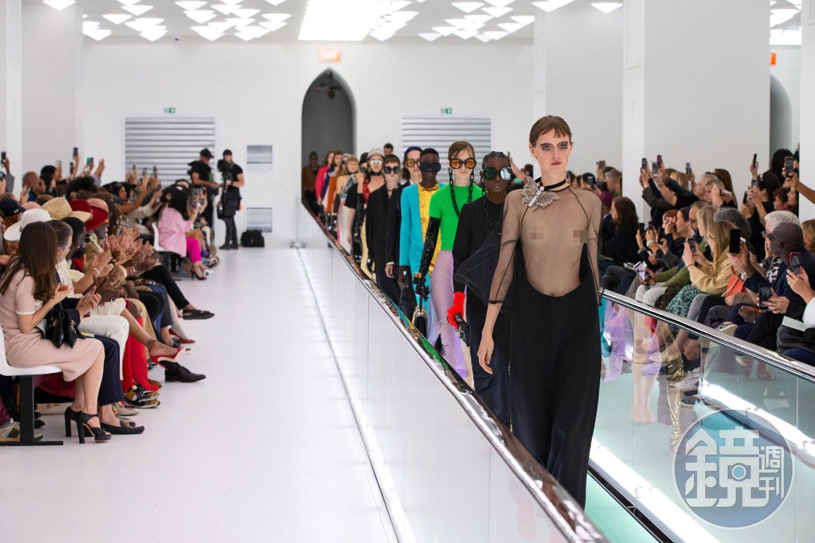 這是一個好舒服的秀場!伴隨著微微的風,黑色布景裡有白色的帳幕輕輕飄著,與服裝的飄逸面料相互呼應。