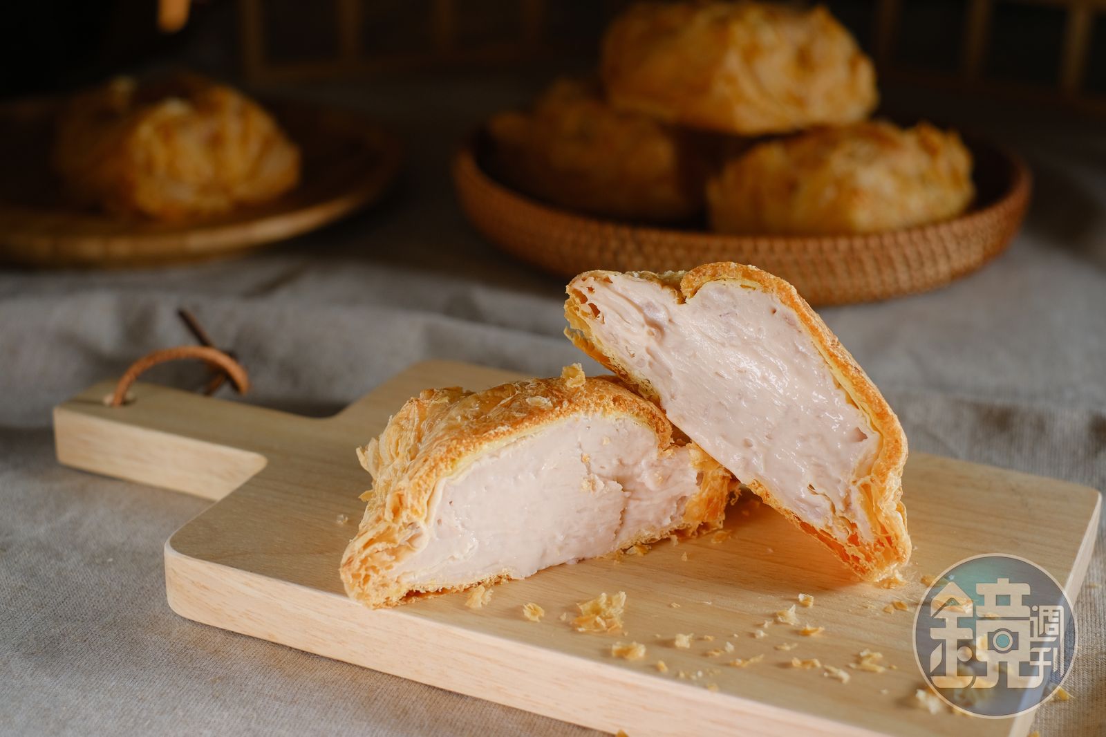 因為法國YouTuber拍影片介紹而爆紅的「芋頭泡芙」,近期成了明星商品,每天至少賣出200個。起酥皮要先烤到蓬鬆,塞進的芋泥餡除了多達100公克,還調入牛奶增加濕潤感,一口咬下,酥鬆綿濃,難怪能收服嘴刁的法國人。