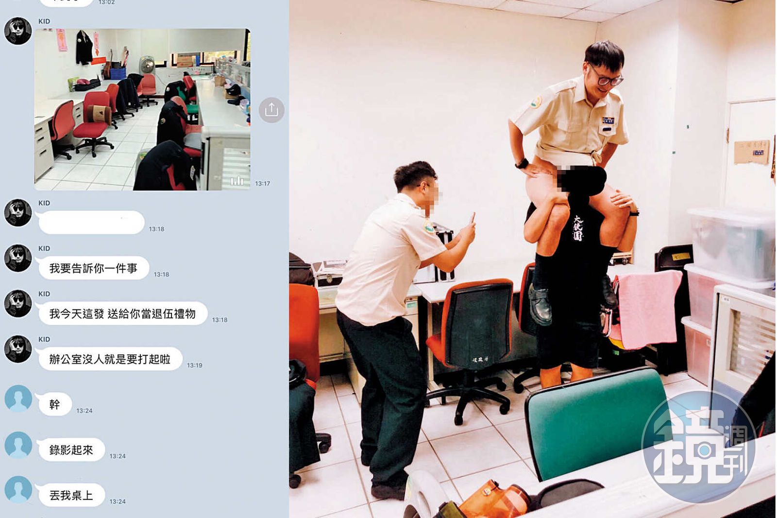 KID(右)在辦公室內,裸臀騎在同袍身上,其他人則起鬨拍照。另外他還在另一名役男屆退時,揚言在辦公室打手槍,作為退伍禮物。(讀者提供)發布時間:2019.10.16 05:59 臺北時間