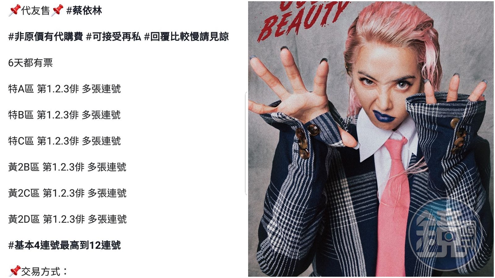 有黃牛在臉書或LINE上販售蔡依林演唱會的連號門票,疑似涉及詐騙。(翻攝畫面)從本刊取得的黃牛票資訊來看,這些黃牛利用「大咖歌手演唱會一位難求」為訴求,以飢餓行銷的手法來營造自己取得連號的票券,以一張5至6倍的價格哄抬;不少粉絲為了心儀的偶像,都會不計代價來向黃牛詢價,卻誤中這些黃牛的詐騙陷阱,連同陳姓女粉絲在內的被害人,因此損失上萬元,欲哭無淚。
