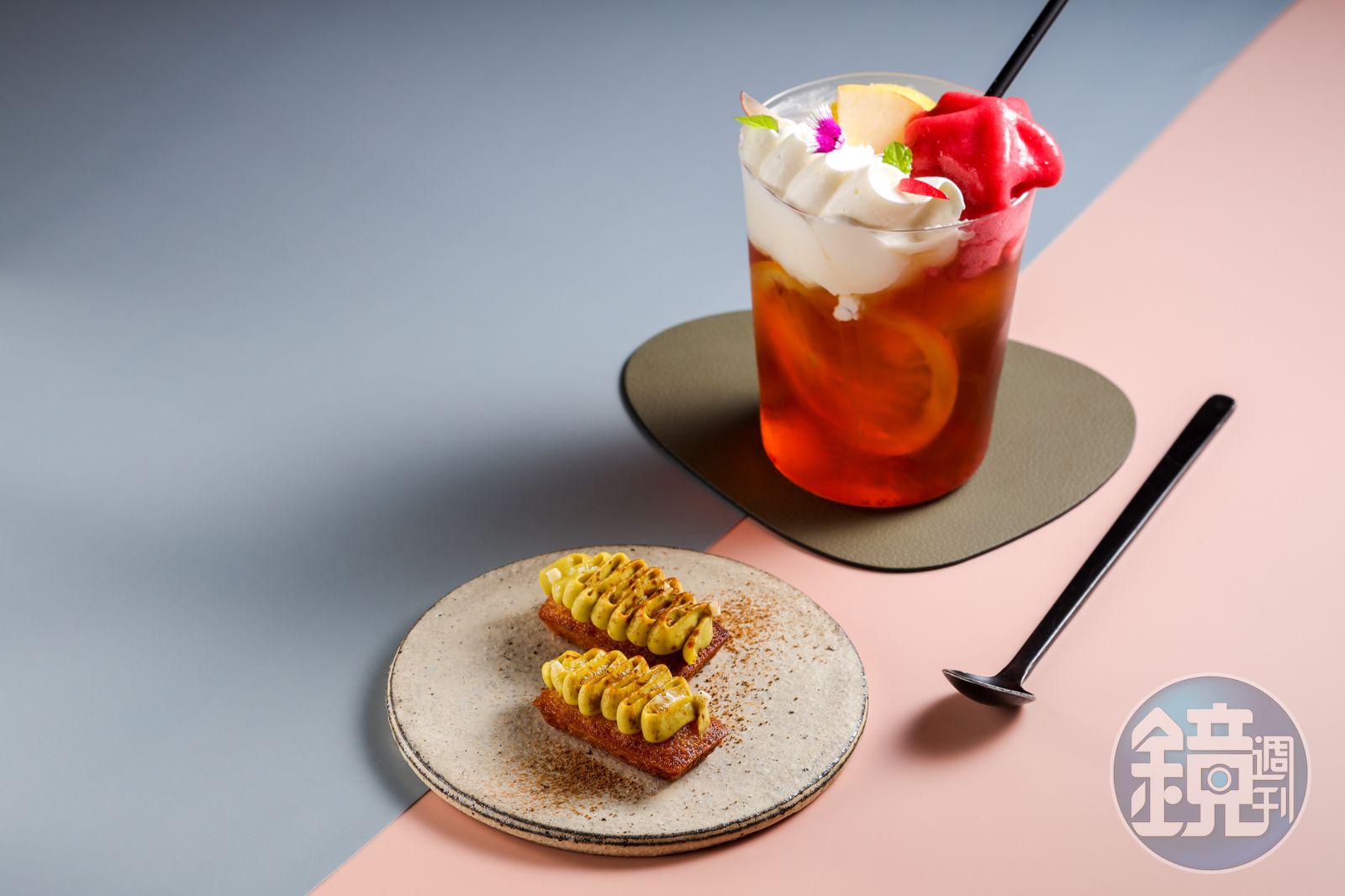 「Chante Tea」沒有蛋糕,攪拌著喝滿是水果蛋糕的豐郁。 「Signature Mochi」的內在是Q糯紅豆煎茶年糕,外層烤得酥脆。(120元/份) Yen和Katia都曾在國際名廚江振誠的「Restaurant ANDRÉ」歷練,本是抱著向偶像請益的想法,並鼓起勇氣邀請江振誠加入團隊,沒料到大廚一口答應。在日本京都「Kaikado Café開化堂咖啡」首次快閃活動,依循江振誠提議,設計出如法式料理,講究上餐順序的「One Tree Hill Experience」甜點套餐。